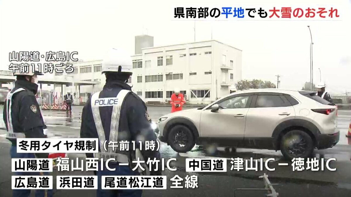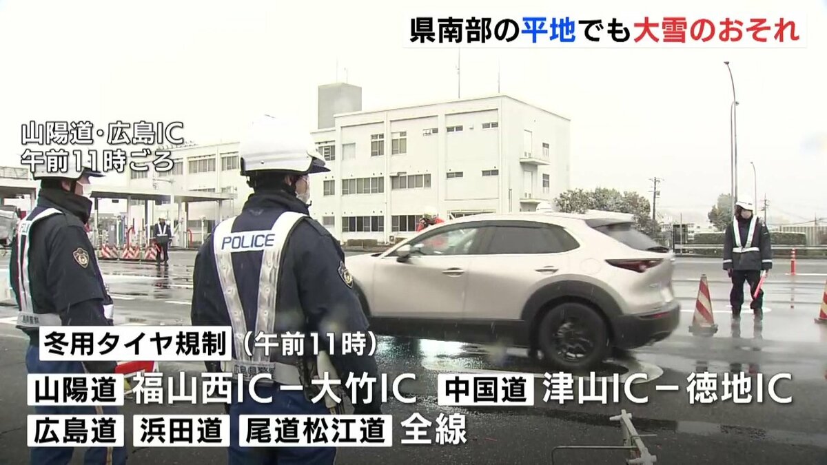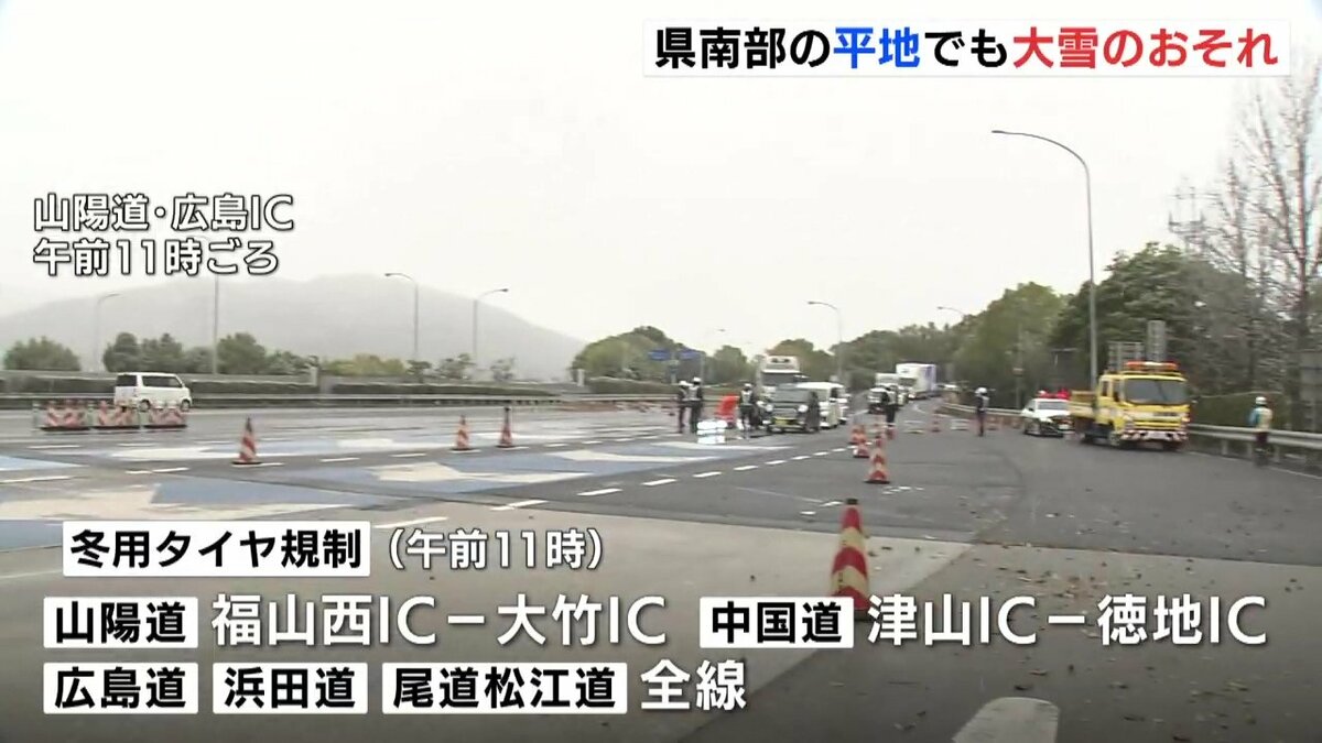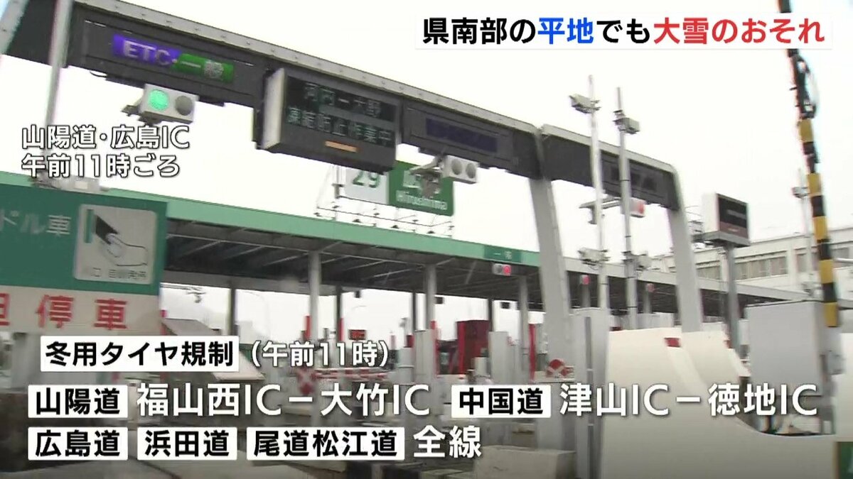 午前11時現在、山陽道は、福山西ICから大竹IC。中国道は、津山ICから徳地ICなどで、冬用タイヤ規制が実施されています。