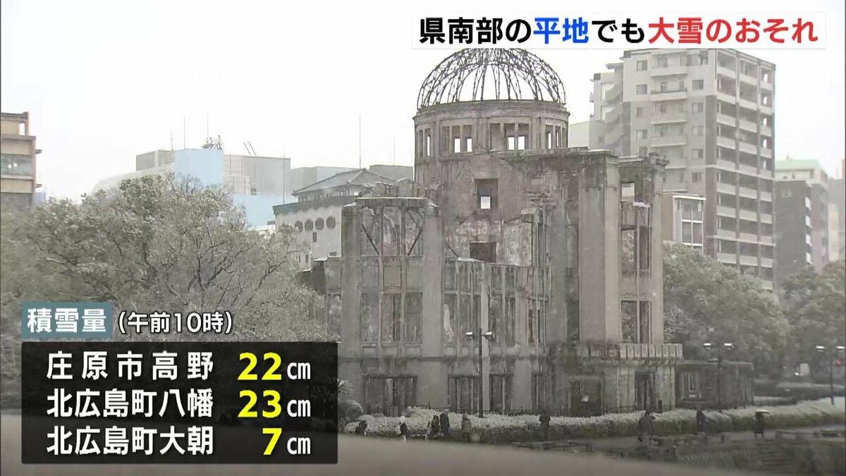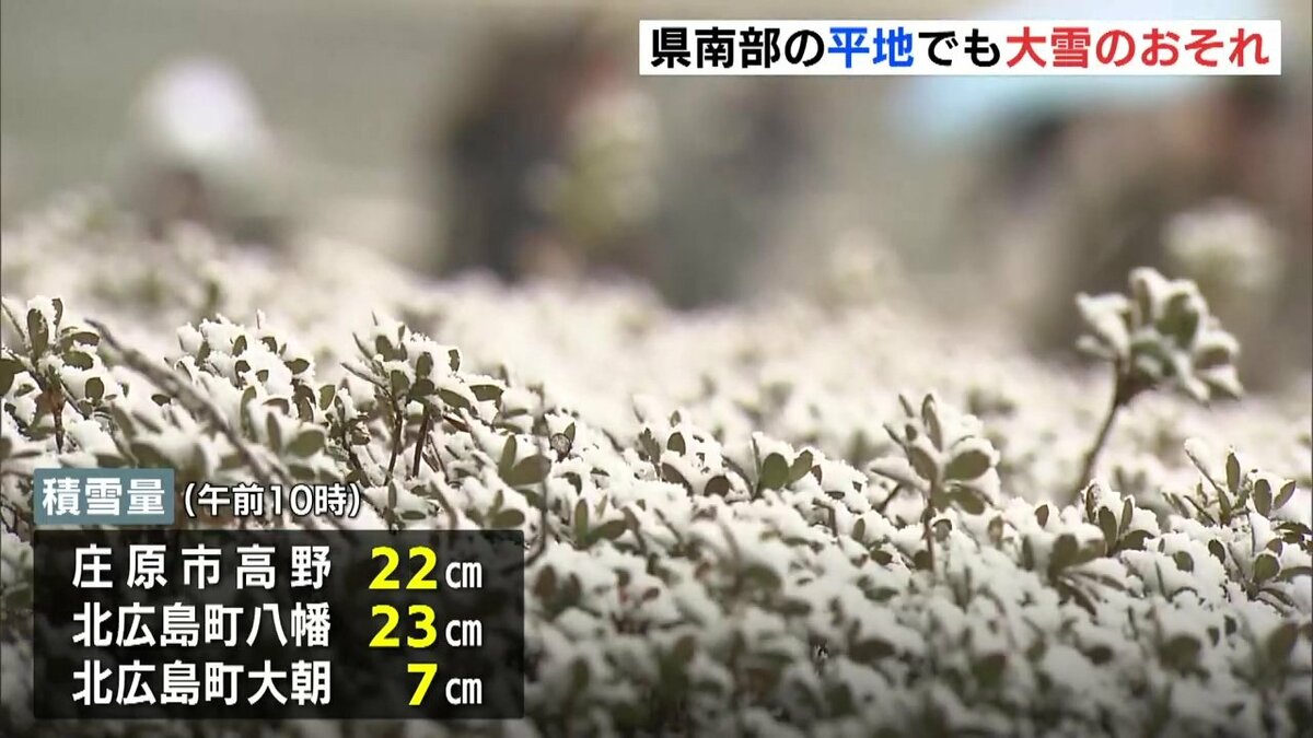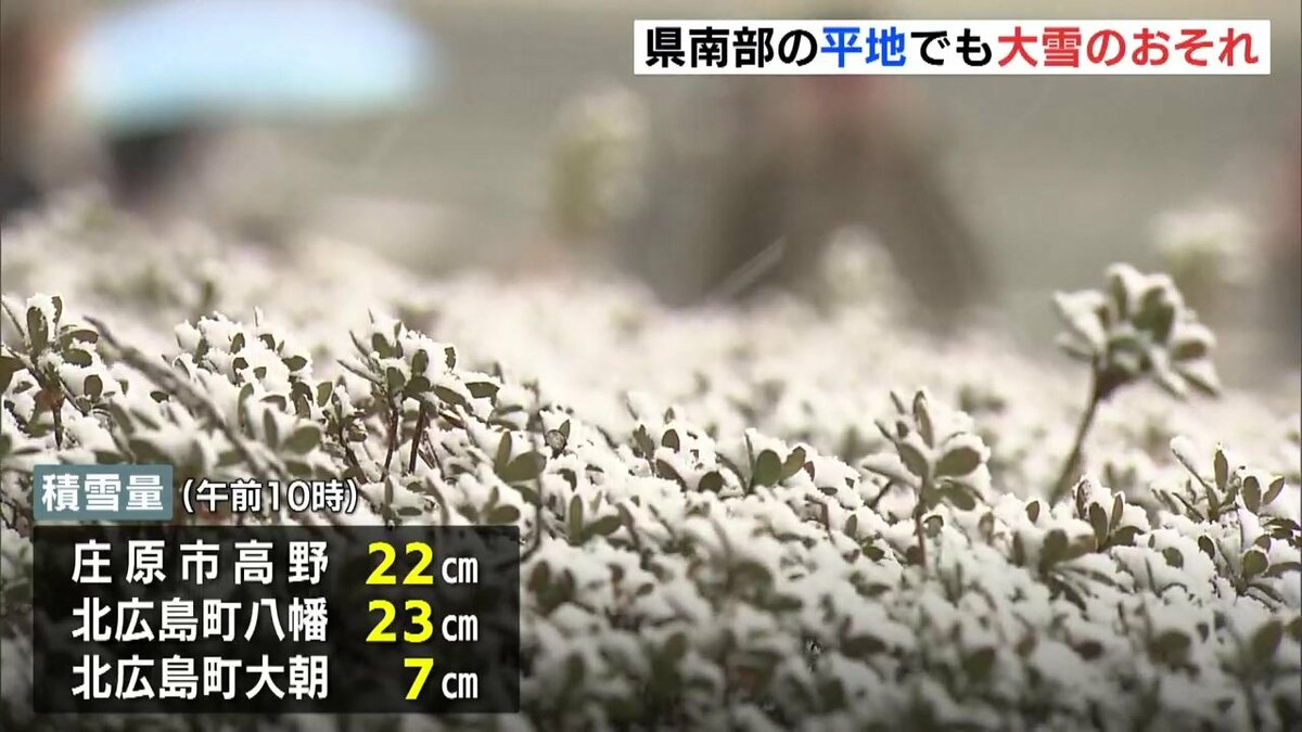 午前10時の積雪は、庄原市高野で22センチ。北広島町八幡で23センチ。北広島町大朝で7センチを観測しました。