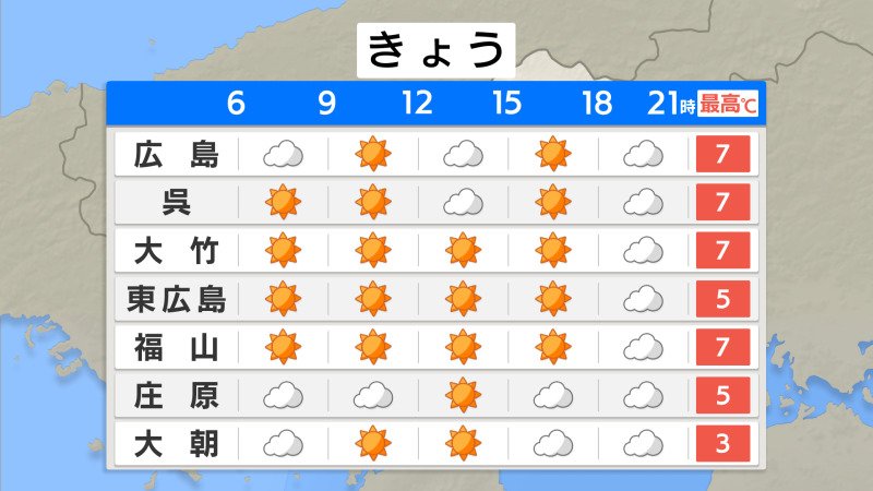 きょう12日(月)成人の日の広島県内の朝は、各地で底冷えとなりました。最低気温は、広島市中区で-1.5℃・庄原市-4.5℃・東広島市-7.4℃・世羅町-7.6℃など各地で凍えるような寒さとなっています。