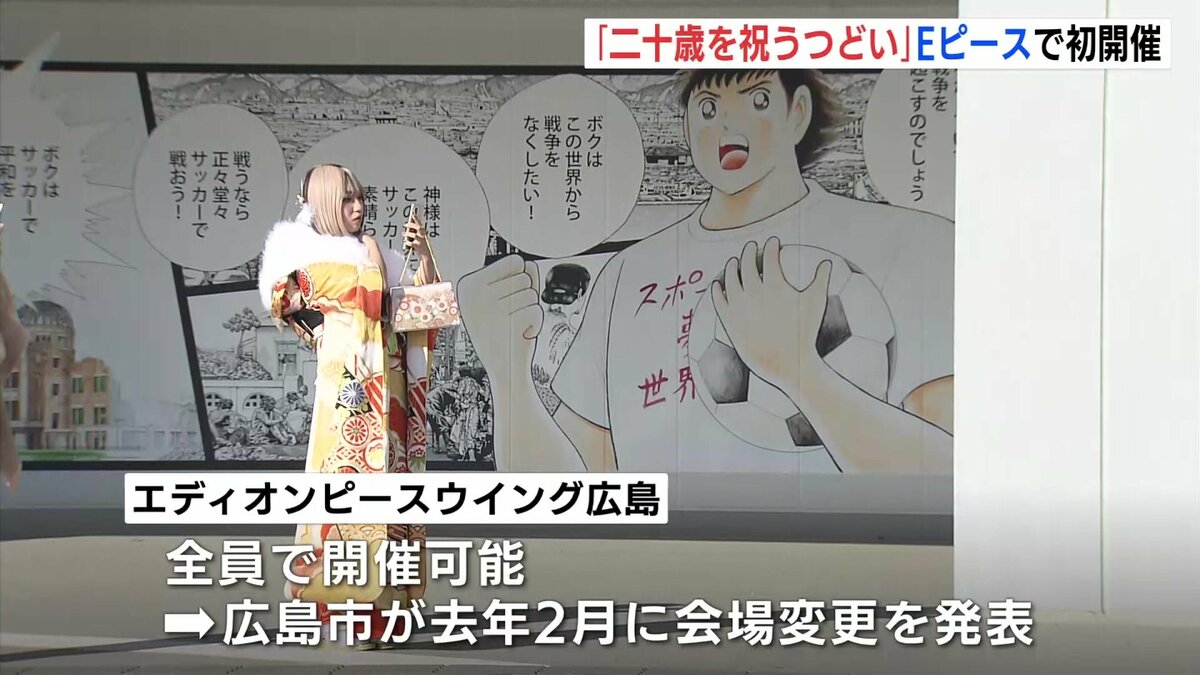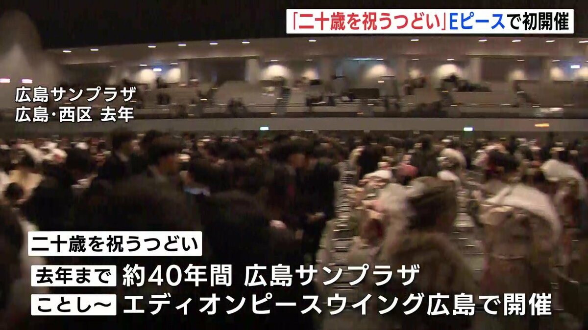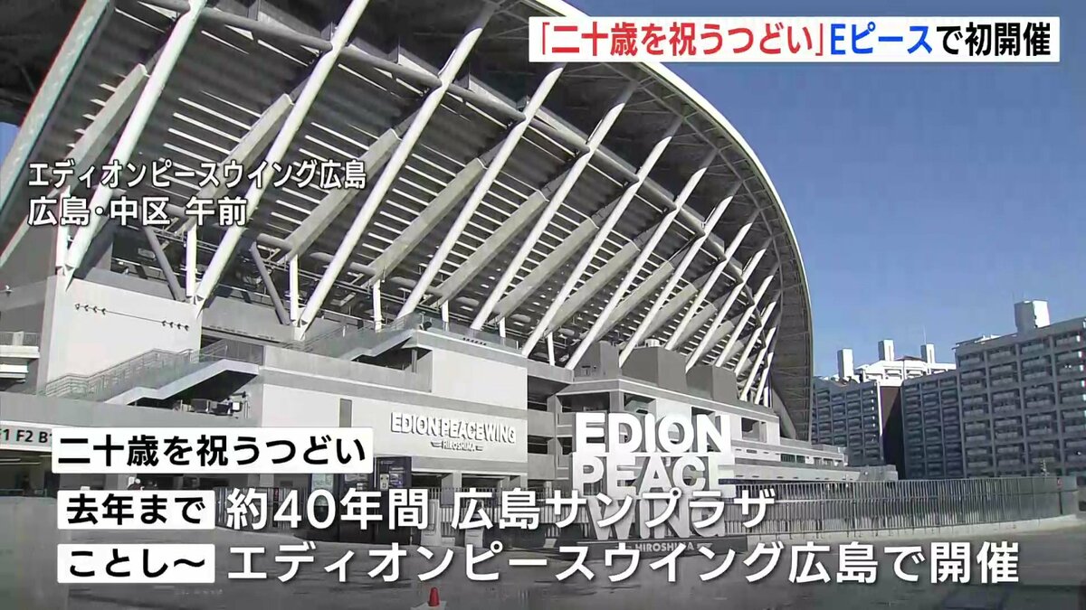 広島市の「二十歳を祝うつどい」は去年までの約40年間、西区の広島サンプラザで開かれてきましたが、ことしから初めて、中区のエディオンピースウイング広島で開催されます。