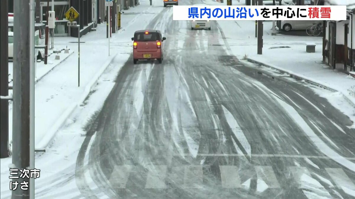 三次市中心部では12日朝、白く凍結した路面の上を、車や人が慎重に通行する姿がみられました。
