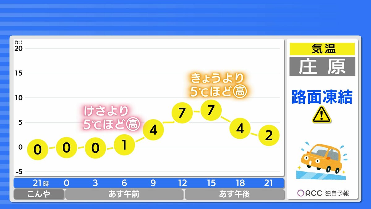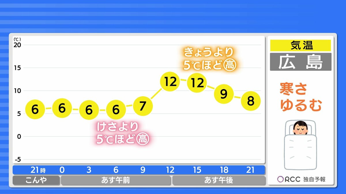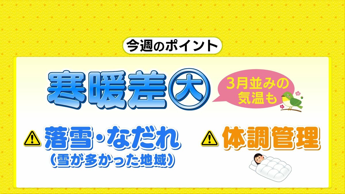 あすは朝の気温、日中の気温ともにきょうよりも5℃ほど高くなる見込みです。寒さは感じそうですが、気温としてはきょうよりも大幅に高くなり、日差しの暖かさも感じられそうです。雪が多かった地域では、落雪やなだれに注意が必要です。
