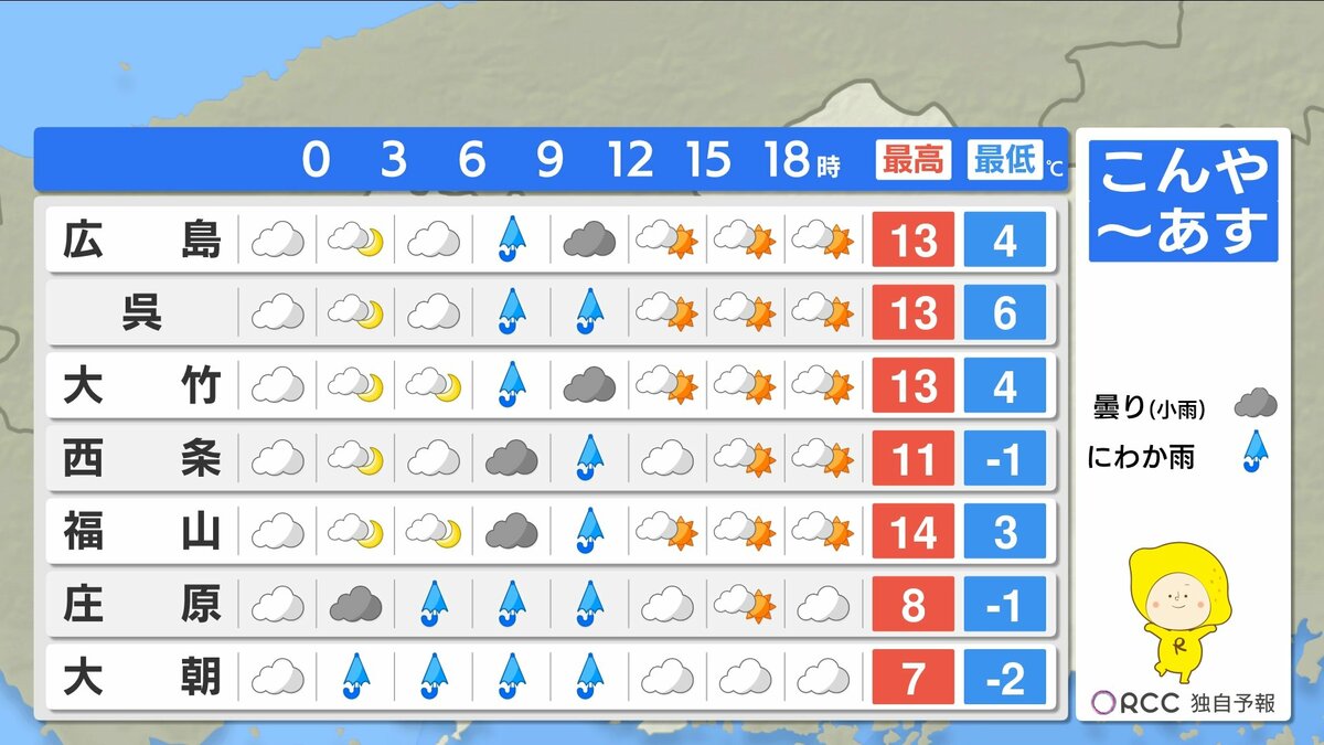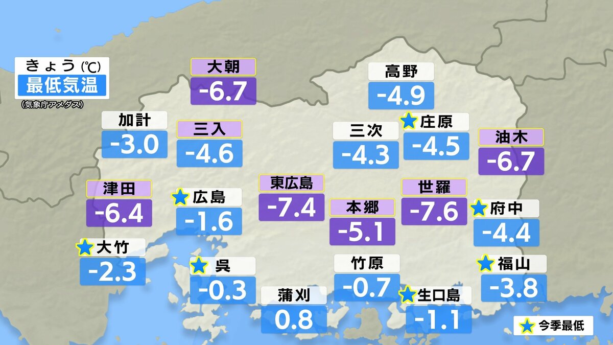きょう1月12日(月・祝)の広島県内は、明け方までを中心に雪が残った所もありましたが、次第に雪のピークは過ぎ、南部では朝からよく晴れました。最低気温は、蒲刈以外の全地点で氷点下を記録し、広島市中区では今季一番の冷え込みとなりました。日中の気温もほとんど上がらず、各地で真冬の寒さになりました。