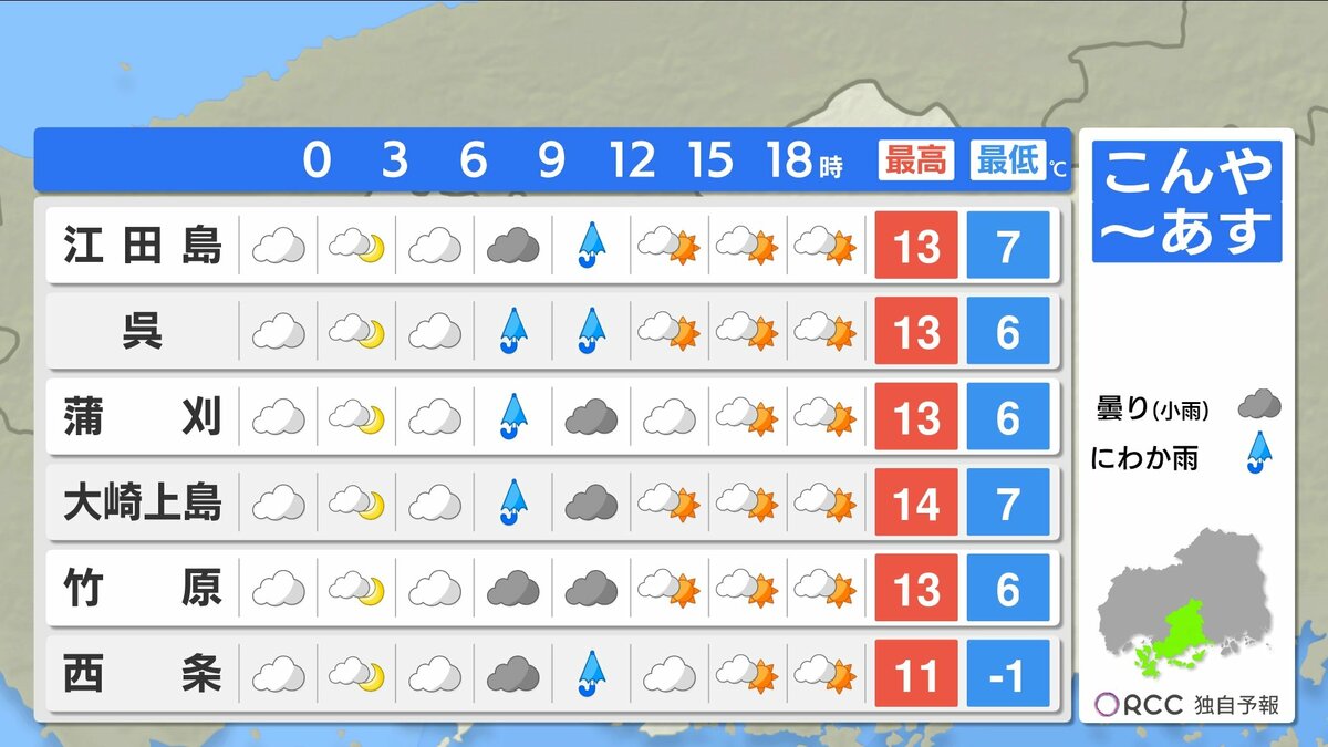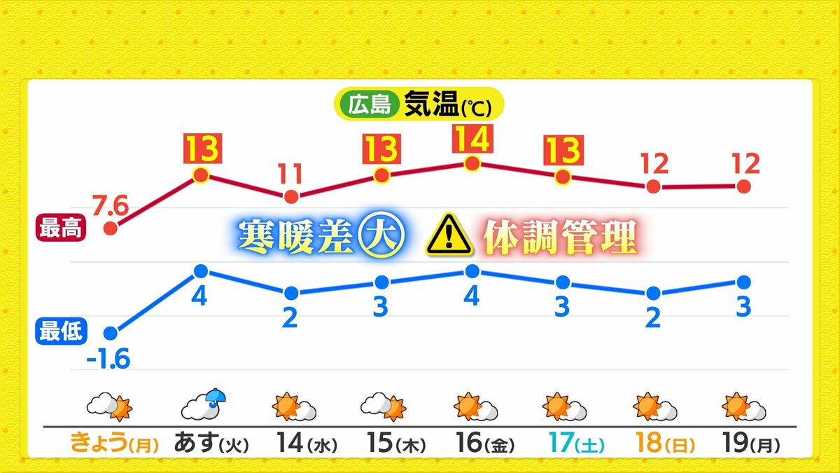 あすは一時的に雨が降りますが、あさって以降晴れ間の広がる日が多くなるでしょう。日中の気温は、沿岸部で12℃~14℃の日が多く、3月並の気温になる見込みです。日差しのぬくもりがあるでしょう。寒暖差が短期間にかなり大きくなります。体調管理にはご注意ください。