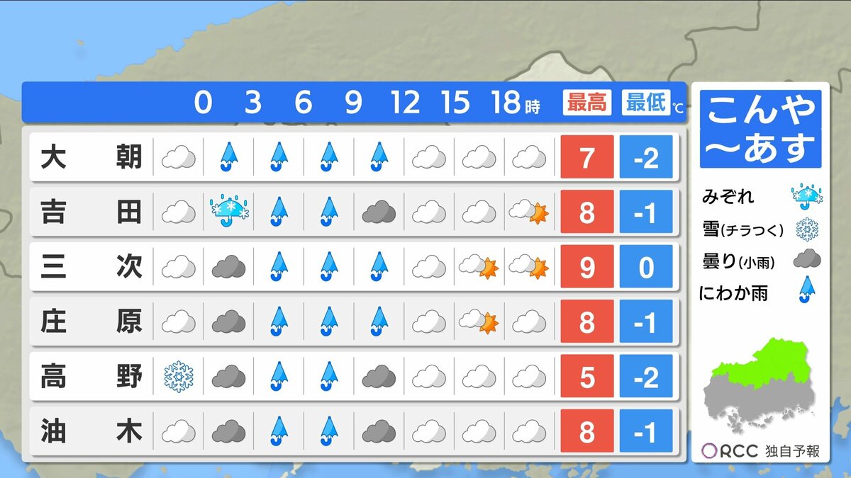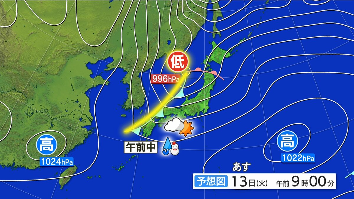 日本海から新たな低気圧や前線が近づき、午前中を中心に雨が降る見込みです。あすは上空の気温が高いため、雨が中心になるでしょう。山沿いでは雪やみぞれが降る予想です。午後は南部を中心に晴れ間が広がるでしょう。