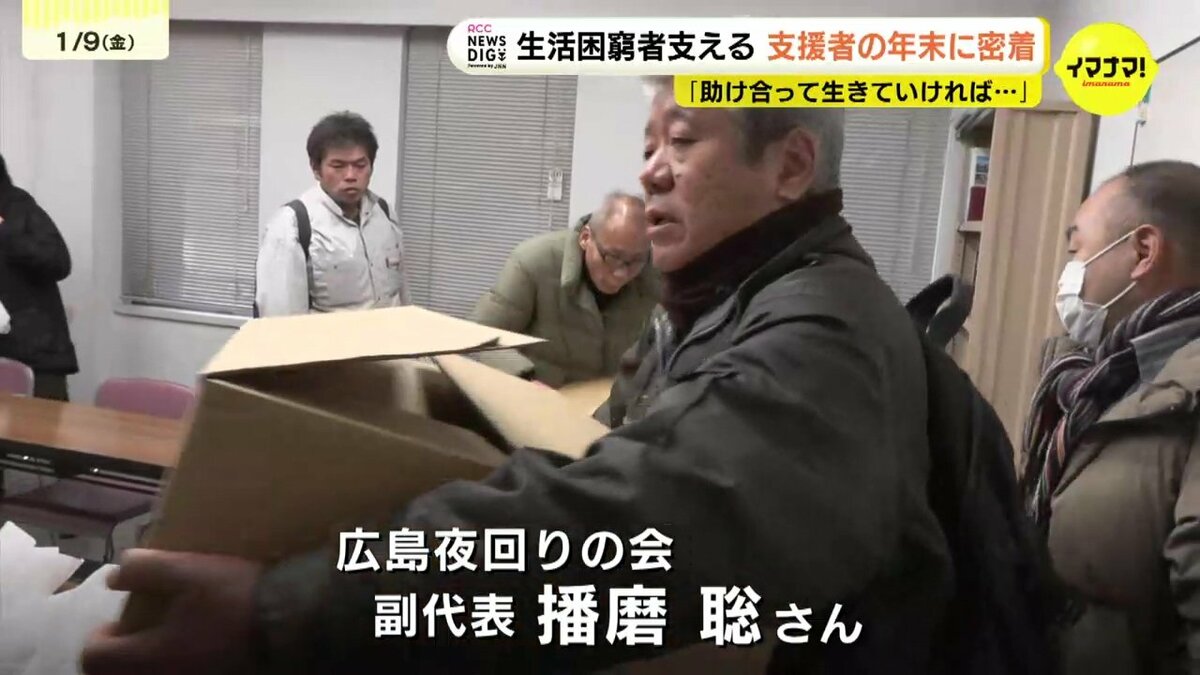 活動しているのは、「野宿労働者の人権を守る広島夜回りの会」のメンバーたち。副代表の播磨聡さんは、約14年にわたってこの活動を続けてきました。生活に困っているたちに食べ物などを届けています。