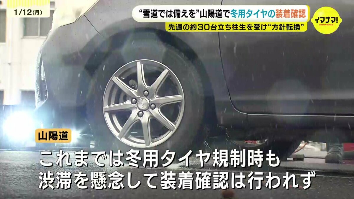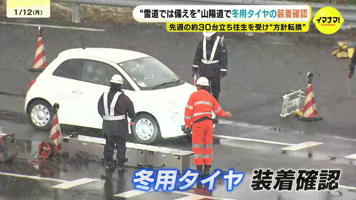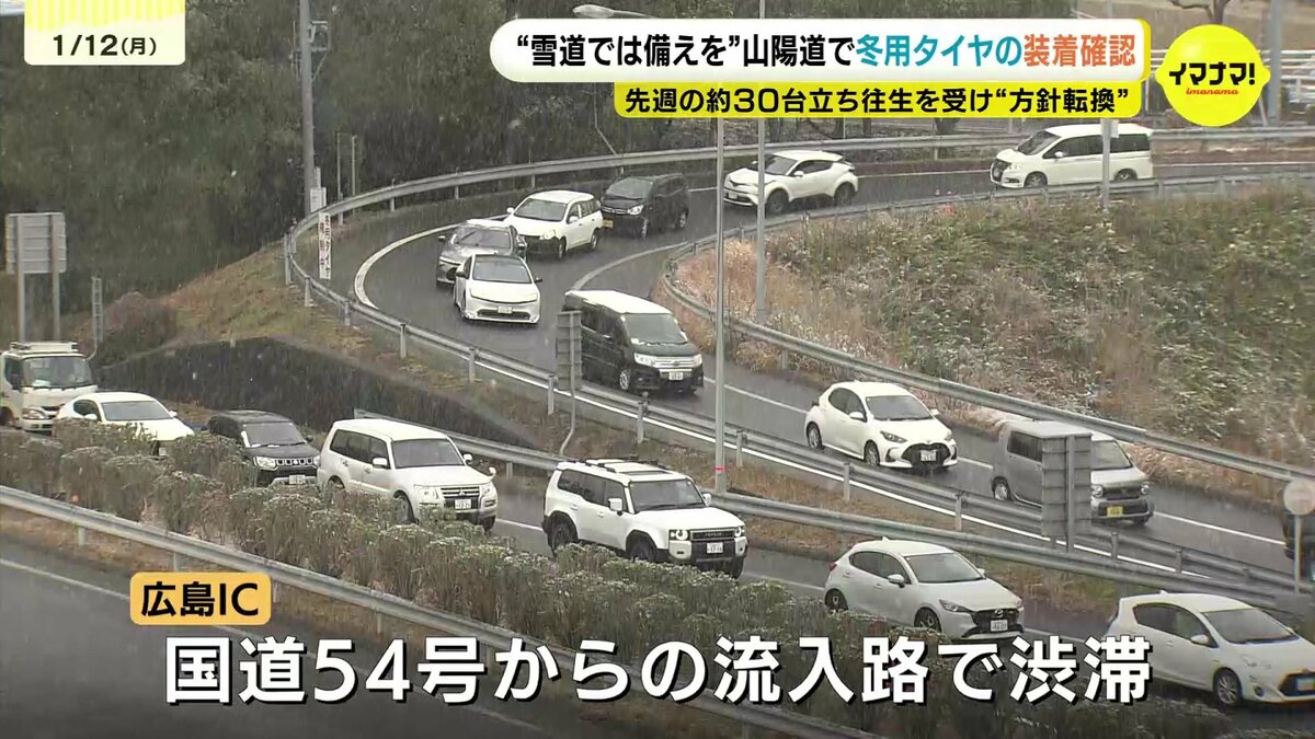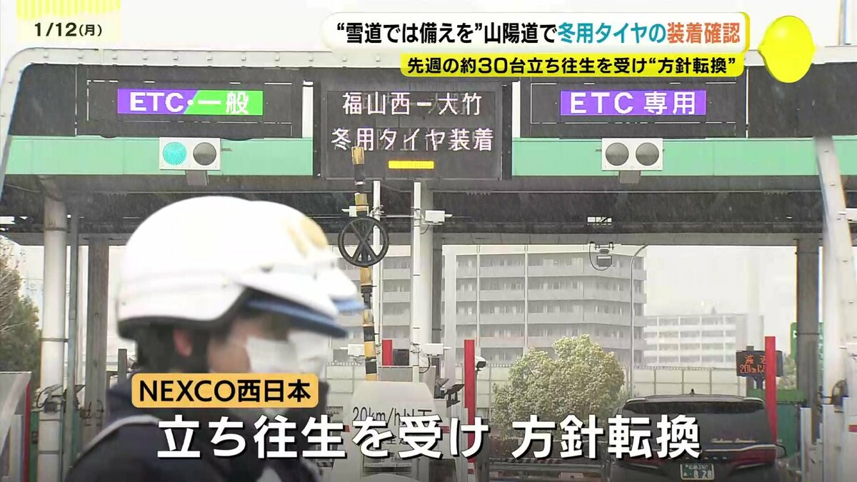 NEXCO西日本中国支社は11日、広く降雪のあった広島県内の山陽道で冬用タイヤ規制を実施し、インターチェンジの手前で1台ずつ冬用タイヤが装着されているか確認しました。背景には、先週発生した約30台の立ち往生がありました。