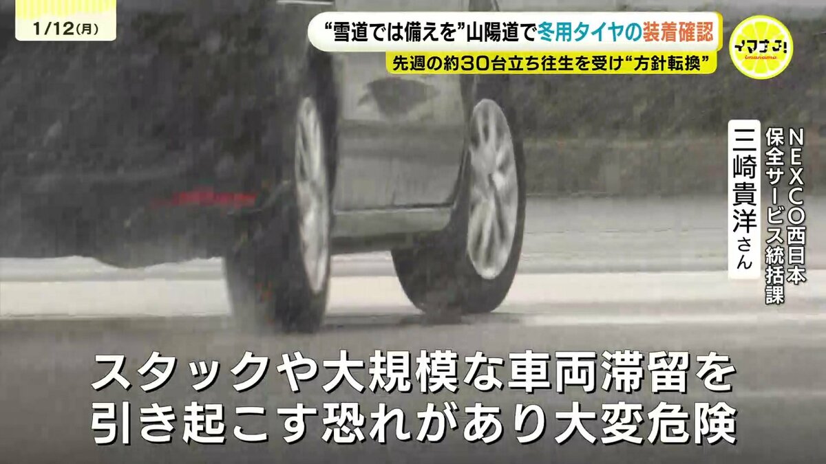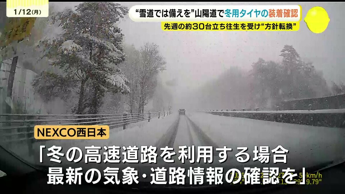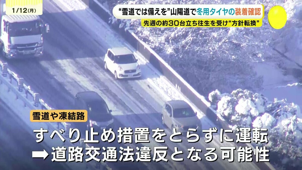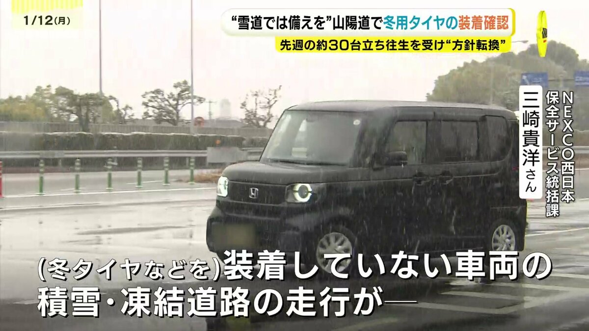 NEXCO西日本中国支社は11日、広く降雪のあった広島県内の山陽道で冬用タイヤ規制を実施し、インターチェンジの手前で1台ずつ冬用タイヤが装着されているか確認しました。背景には、先週発生した約30台の立ち往生がありました。
