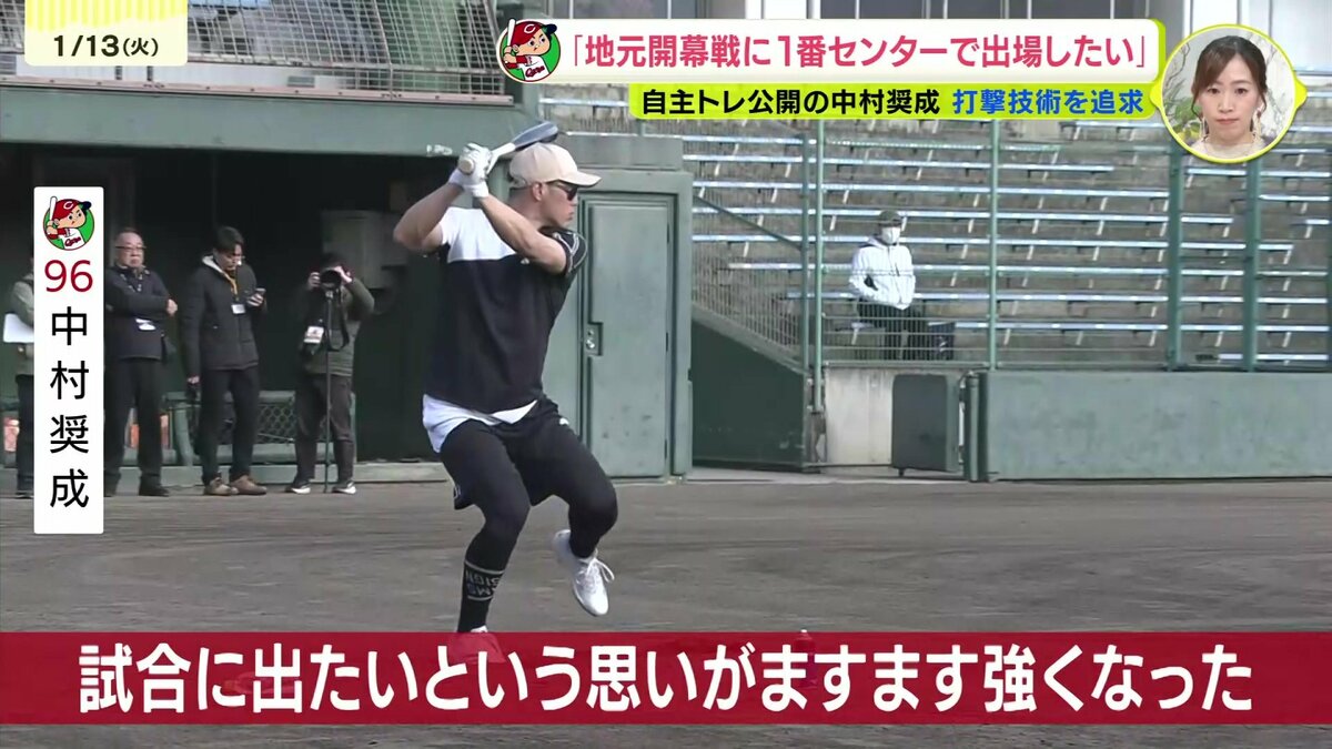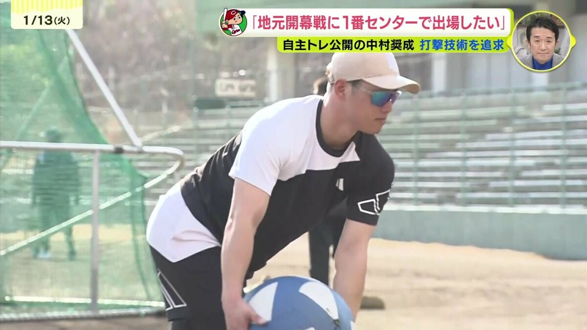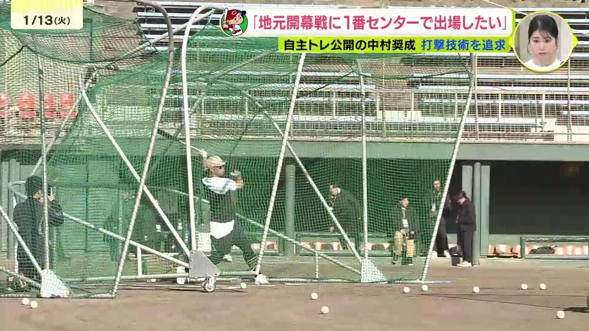 カープの中村奨成が自主トレを公開。地元開幕戦を1番センターで出場したいと力強く述べました。