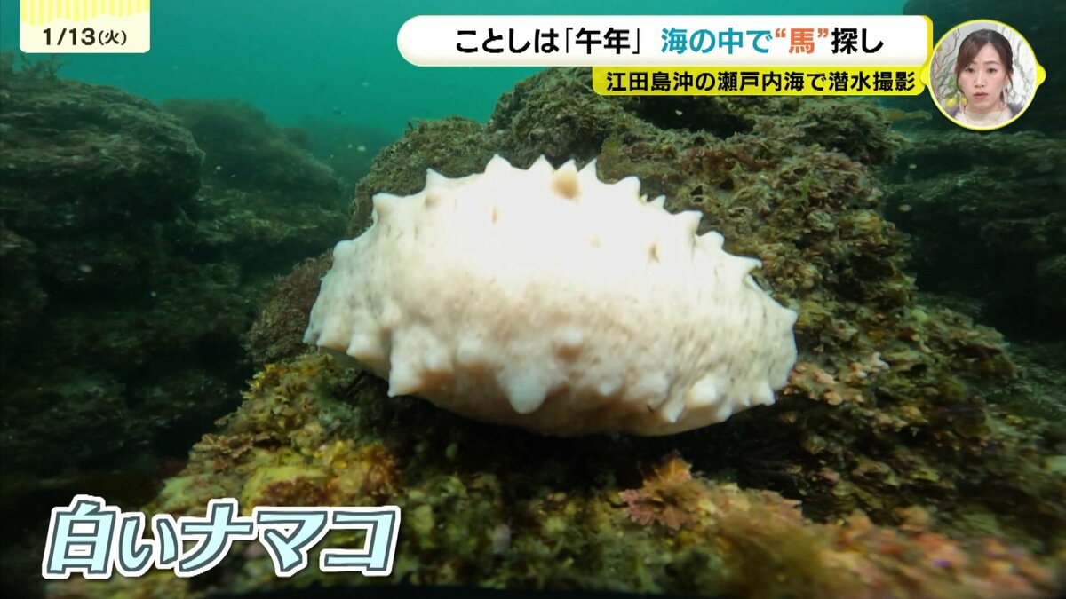 バフンウニを探す中で、水中カメラはこんな光景を捉えました。雪のように美しい「白いナマコ」。突然変異で生まれるそうです。