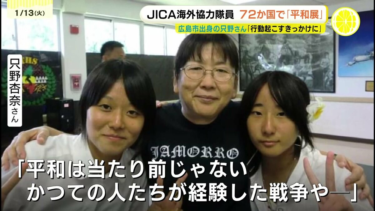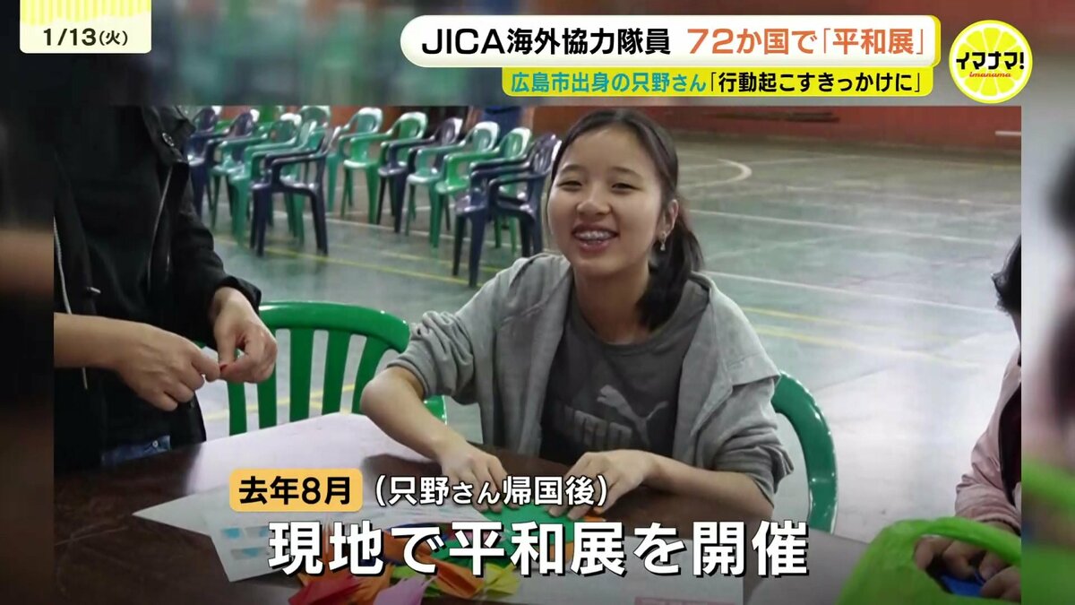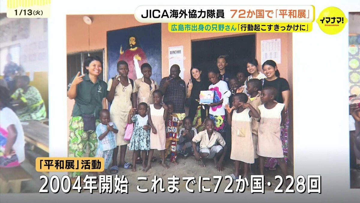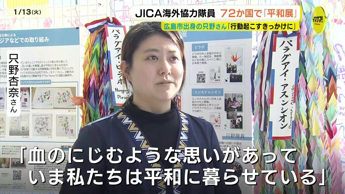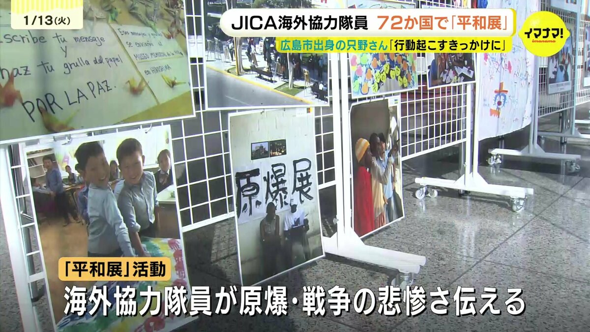 広島市中区の広島国際会議場では、開発途上国を中心に開催されている「平和展」の様子が紹介されています。活動は2004年に始まり、これまでに72か国で合わせて228回、JICAの海外協力隊員が、現地の人々に原爆や戦争の悲惨さを伝えてきました。