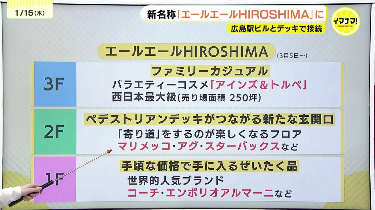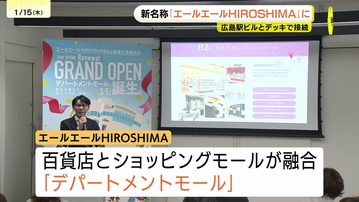 広島駅前のエールエールA館を運営する広島駅南口開発と福屋はきょう合同説明会を開き、広島駅ビルから伸びるペデストリアンデッキが、A館の2階部分に直結する日は3月5日になると発表しました。これにより、館内そのものが『街の通路』として通り抜け可能になります。さらに、建物の南側にも猿猴川の河川敷へと降りていくための新たなデッキが整備される予定です。新名称「エールエールHIROSHIMA」のコンセプトは、百貨店とショッピングモールを融合させた「デパートメントモール」です。デッキが接続する2階を中心に、1階から3階のフロアを大幅に改修します。