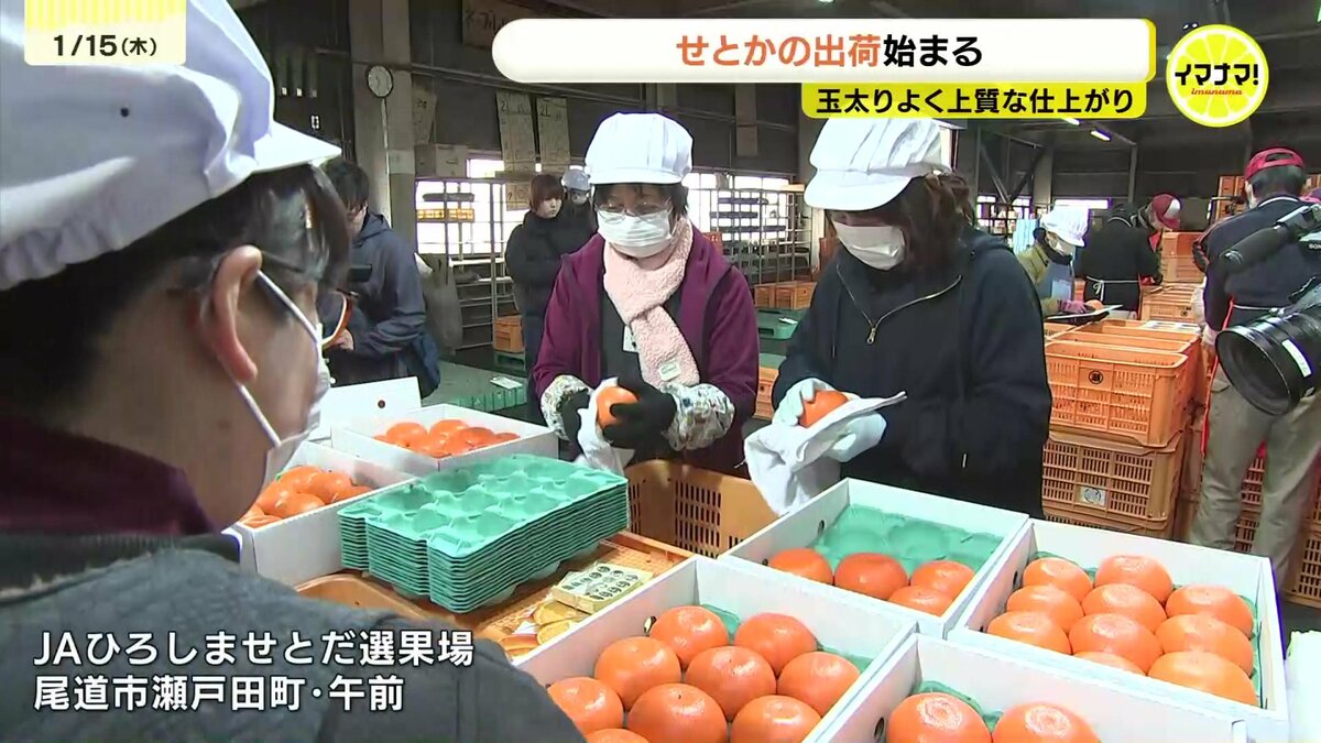 尾道市瀬戸田町にあるJAの選果場には、せとかがおよそ360kg運び込まれ出荷作業が始まりました。作業員は慎重に傷や汚れがないかを確認しながら箱詰めしていました。去年は秋の気温が高かったため、玉太りがよく上質に仕上がったということです。