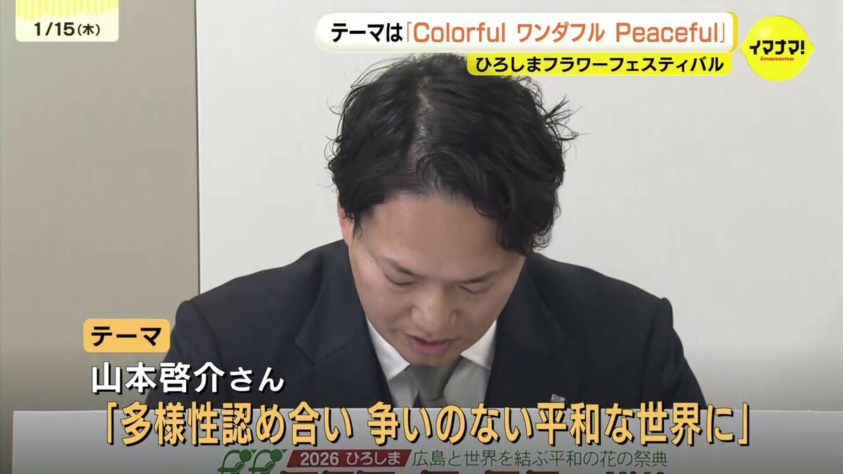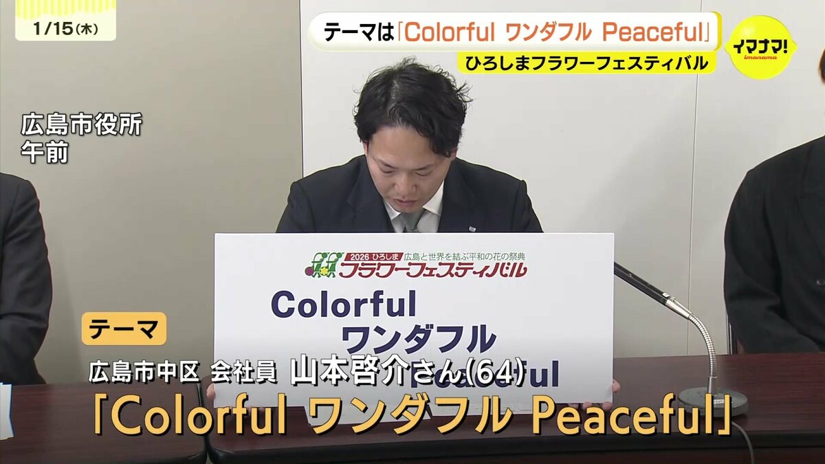 ことしのテーマは、広島市中区に住む64歳の会社員、山本啓介さんの作品、『ColorfulワンダフルPeaceful』に決まりました。全国から寄せられた2071点の中から選ばれました。山本さんは、色とりどりの花をテーマに、「多様性を認めあい、争いのない平和な世界になってほしい」という願いを込めたということです。実行委員会は、「英語とカタカナで、リズムよく、インパクトがある点を評価した」と話しました。