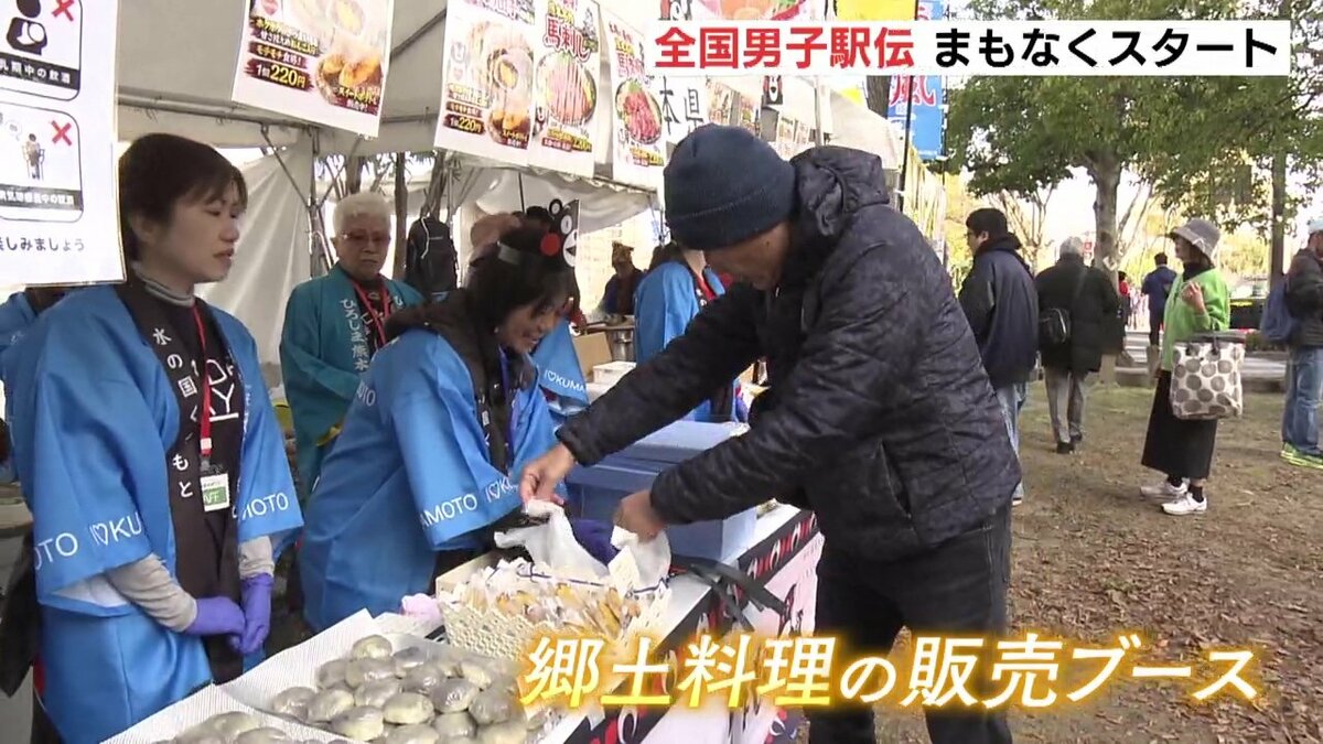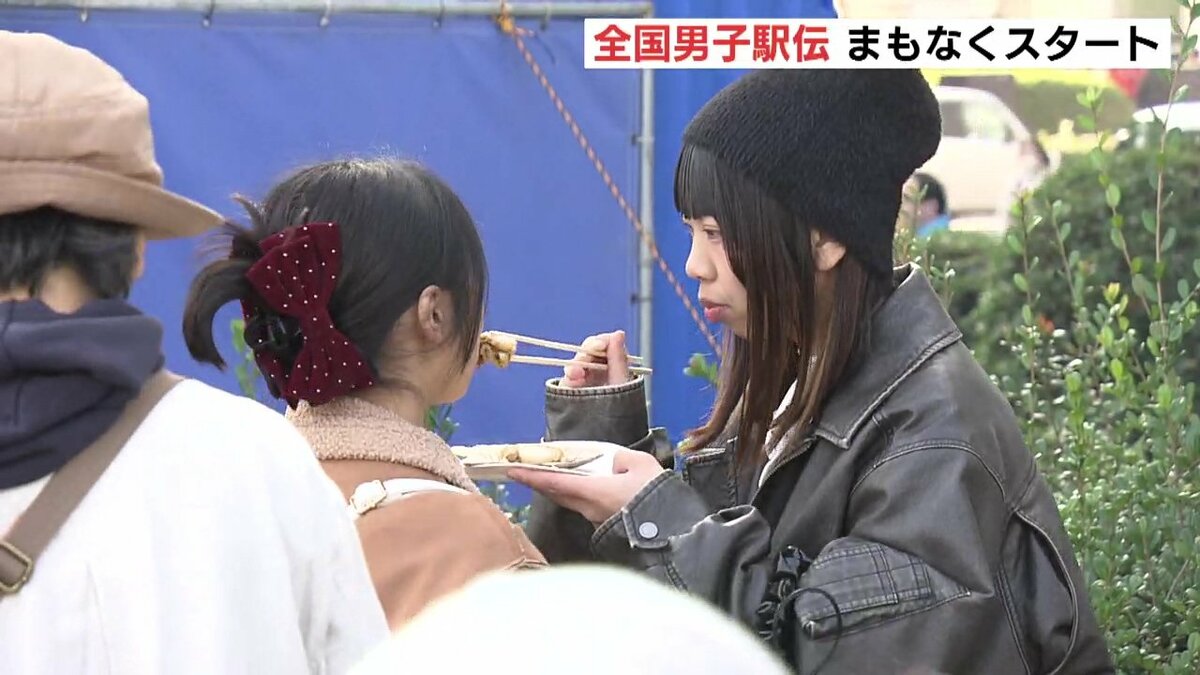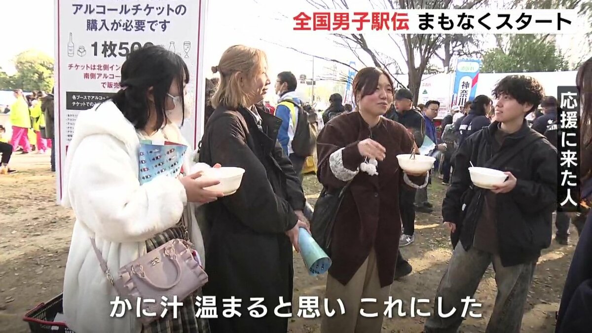 スタート地点そばの平和大通り沿いには、全国各地の郷土料理を販売するブースが設けられました。多くの人で賑わい、北海道のホタテや香川県のうどんなどで身体を温めていました。