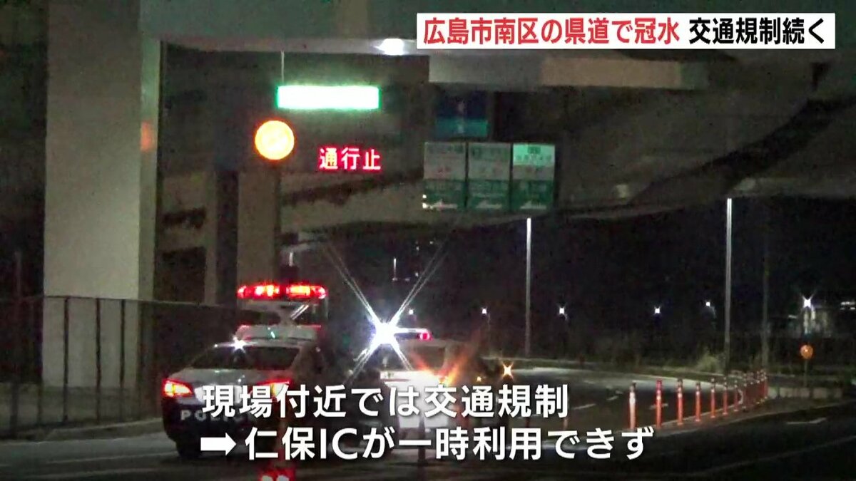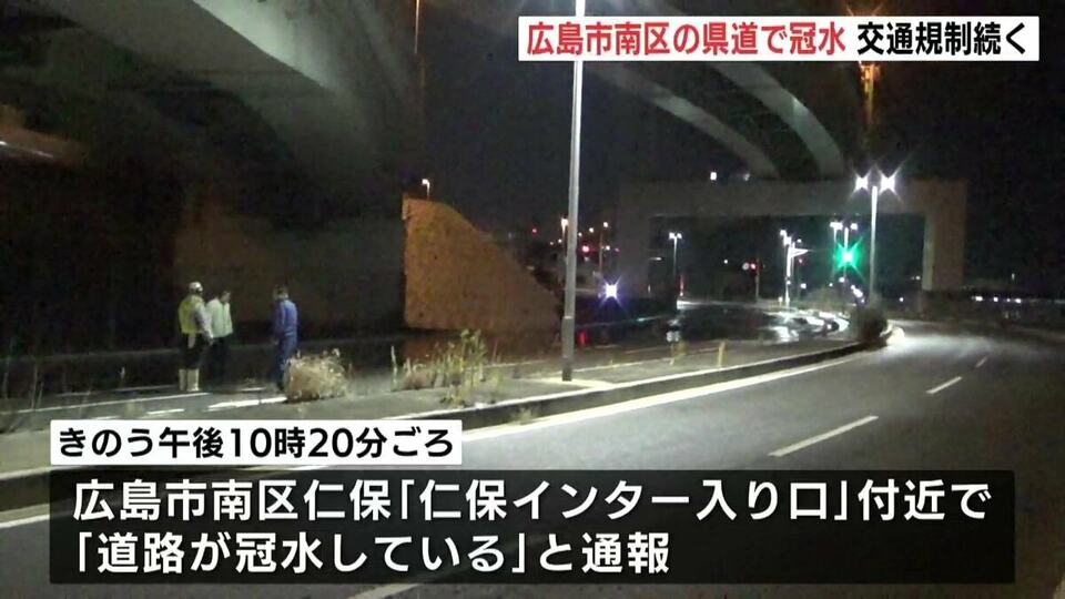警察などによりますと、17日午後10時20分ごろ、広島市南区仁保の「仁保インター入り口」付近で「道路が冠水している」と通報がありました。県水道広域連合企業団によりますと、県道の下を通る工業用水の水道管が破損し、漏水したということです。