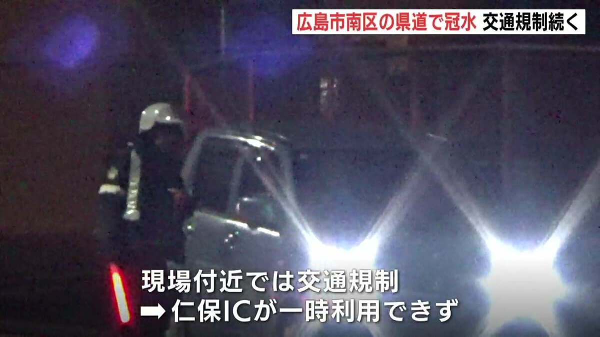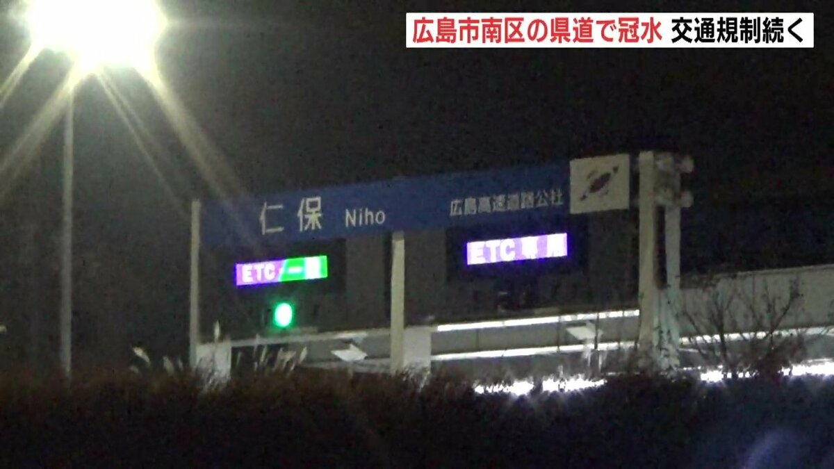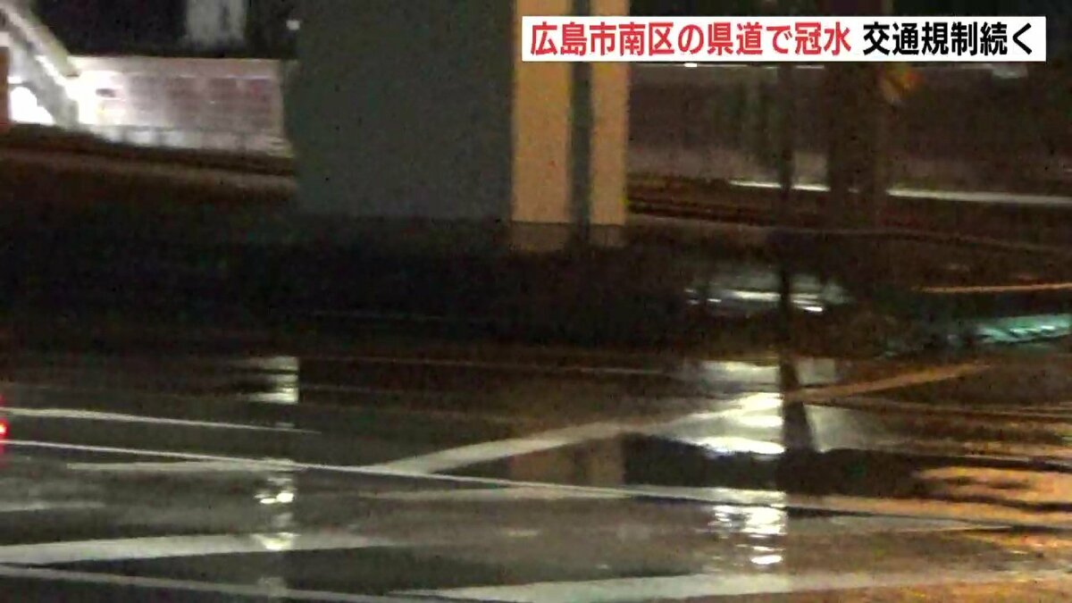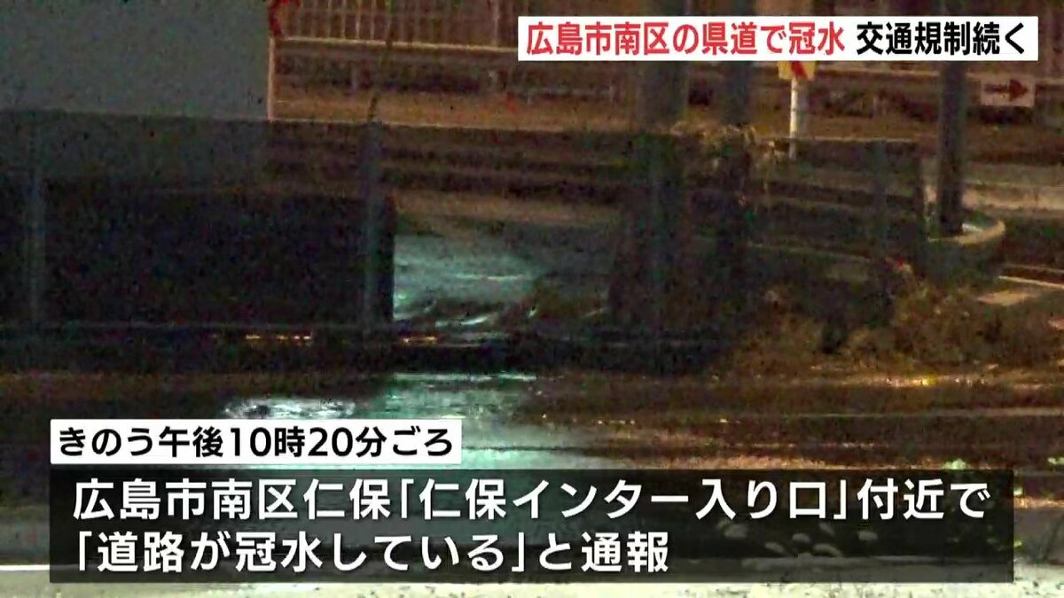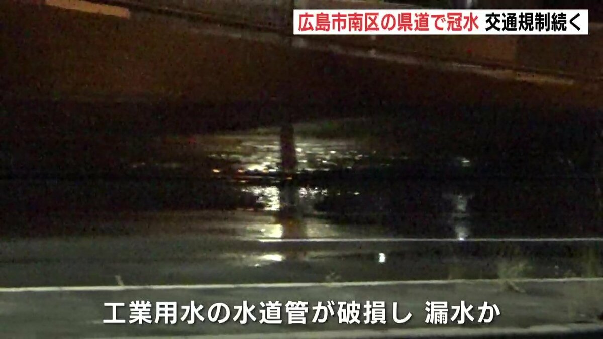17日夜、広島市南区で工業用水の水道管が破損し道路が冠水しました。この影響により、付近の県道で規制が続いています。