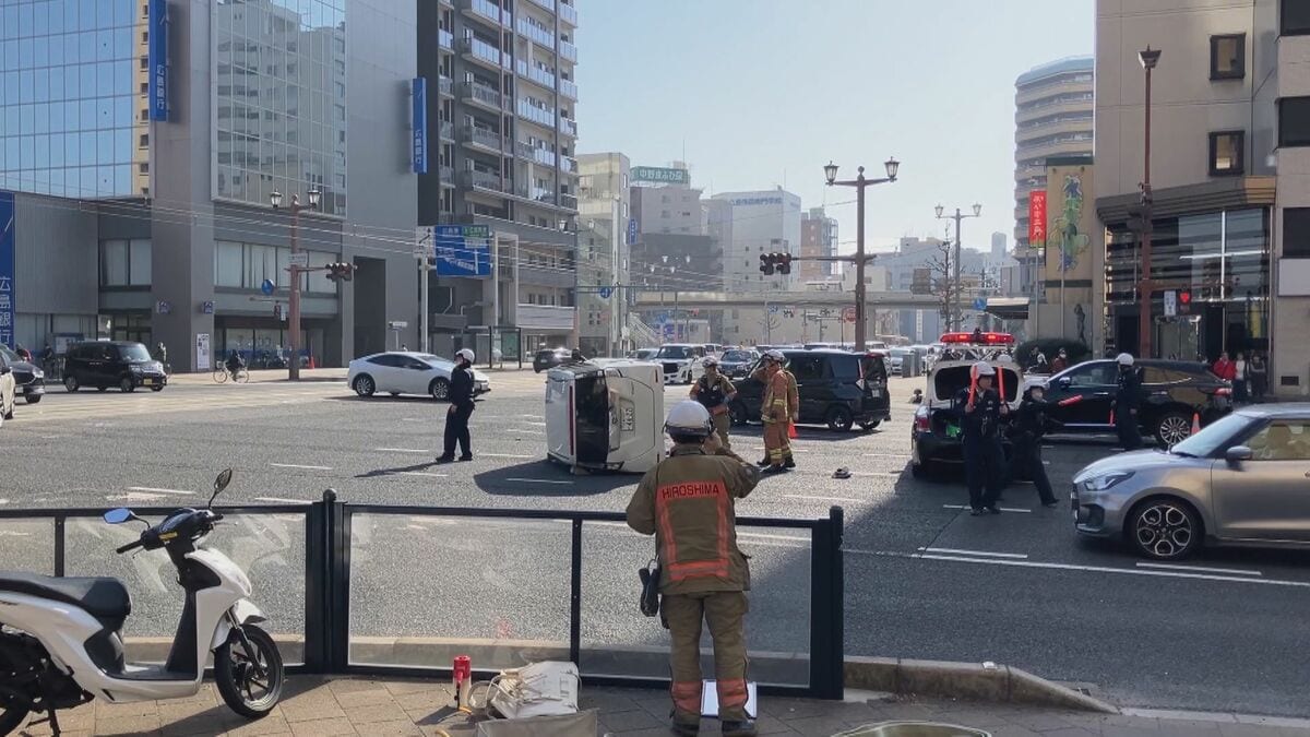 現場は広島市中区大手町にある「広島市役所前交差点」で、交差点を北方向に直進していた乗用車と、対向車線を右折していた乗用車が衝突したということです。