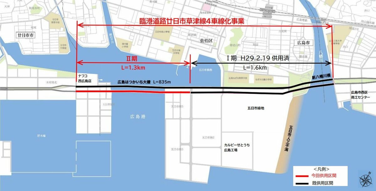この区間の整備が完了することで、広島南道路は、広島市西区の商工センター出入路から、廿日市市の木材港南までの約8kmが4車線になります。