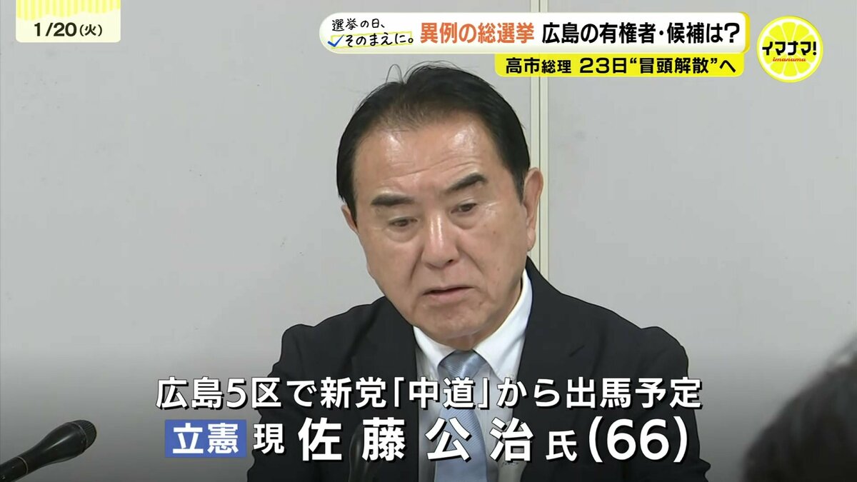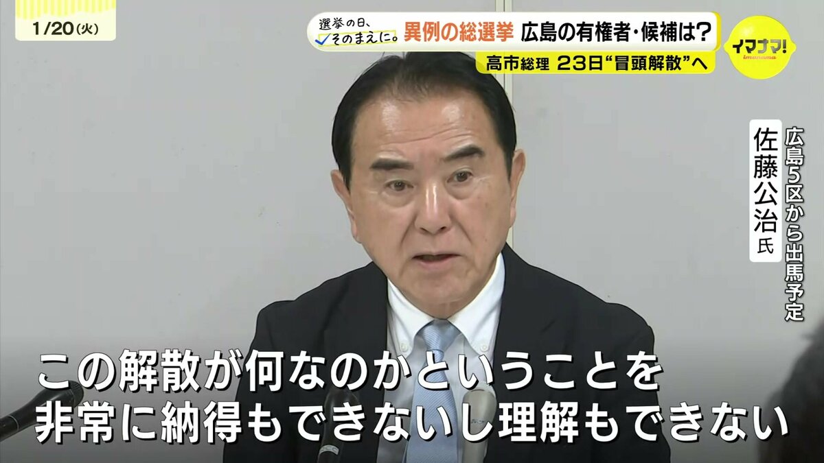 一方、広島5区では立憲民主党・現職の佐藤公治氏(66)が新党「中道改革連合」からの出馬を表明しました。高市総理の解散表明については「この解散が何なのかということが、非常に納得もできないし、理解もできない」と厳しく批判しました。