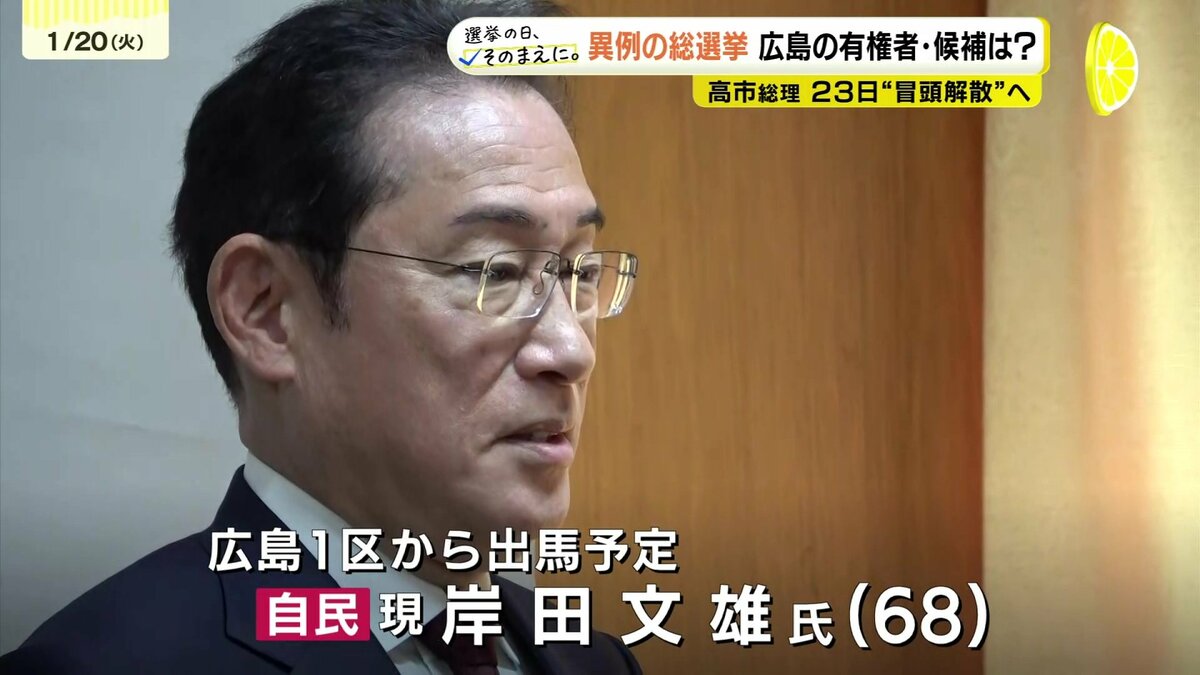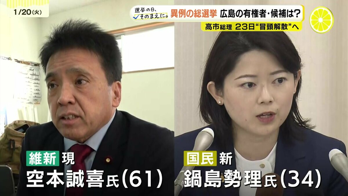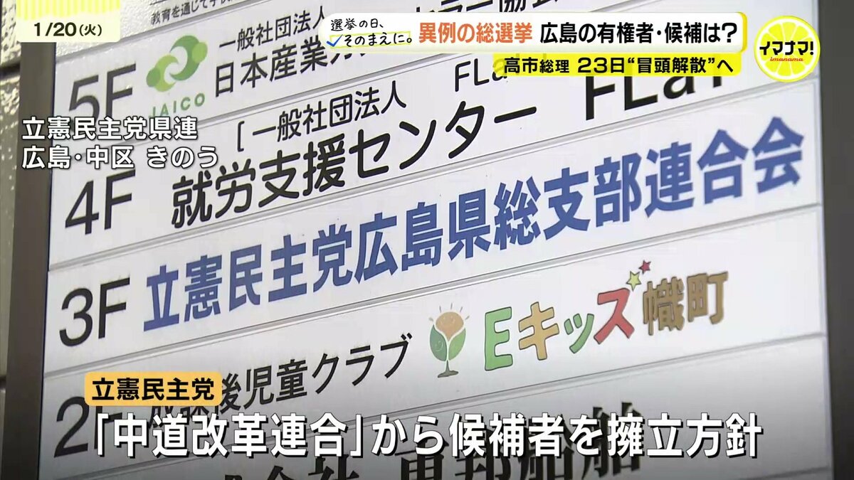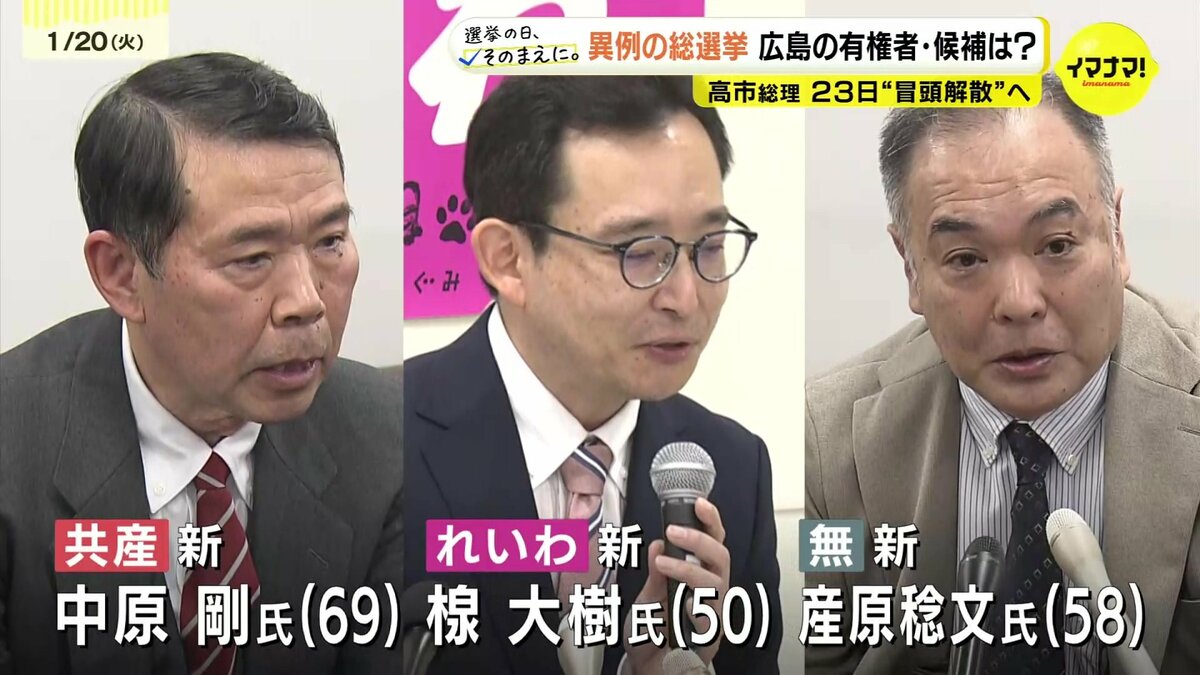 広島1区ではこのほか、日本共産党の中原剛氏(69)が出馬を表明したほか、れいわ新撰組の楾大樹(50)氏、無所属の産原稔文氏(58)が立候補を予定しています。また、立憲民主党も新党「中道改革連合」から候補者を擁立する方針です。