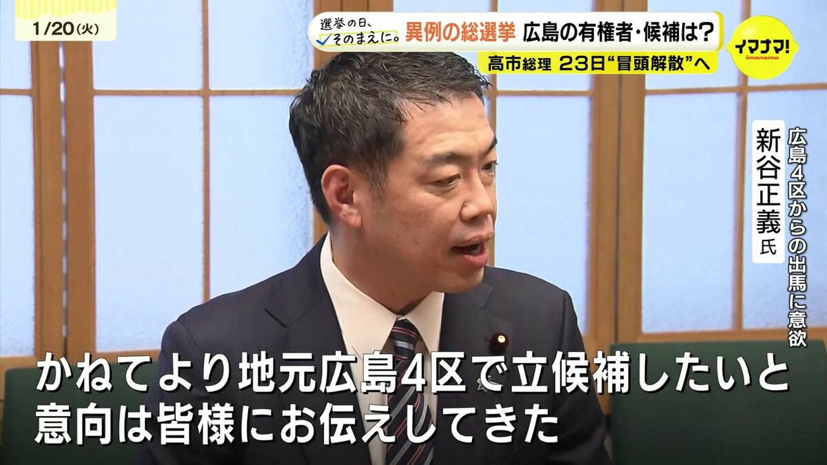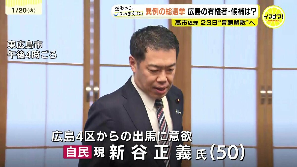 広島4区では、比例中国ブロック、自民党・現職の新谷正義氏(50)が「私自身は、前回比例代表候補ということで望んでおりましたが、かねてより、地元広島4区で立候補したいという意向は皆様にもお伝えしてきました」と述べ、小選挙区の公認は党本部に一任することになっているものの、広島4区からの出馬に意欲を示しています。