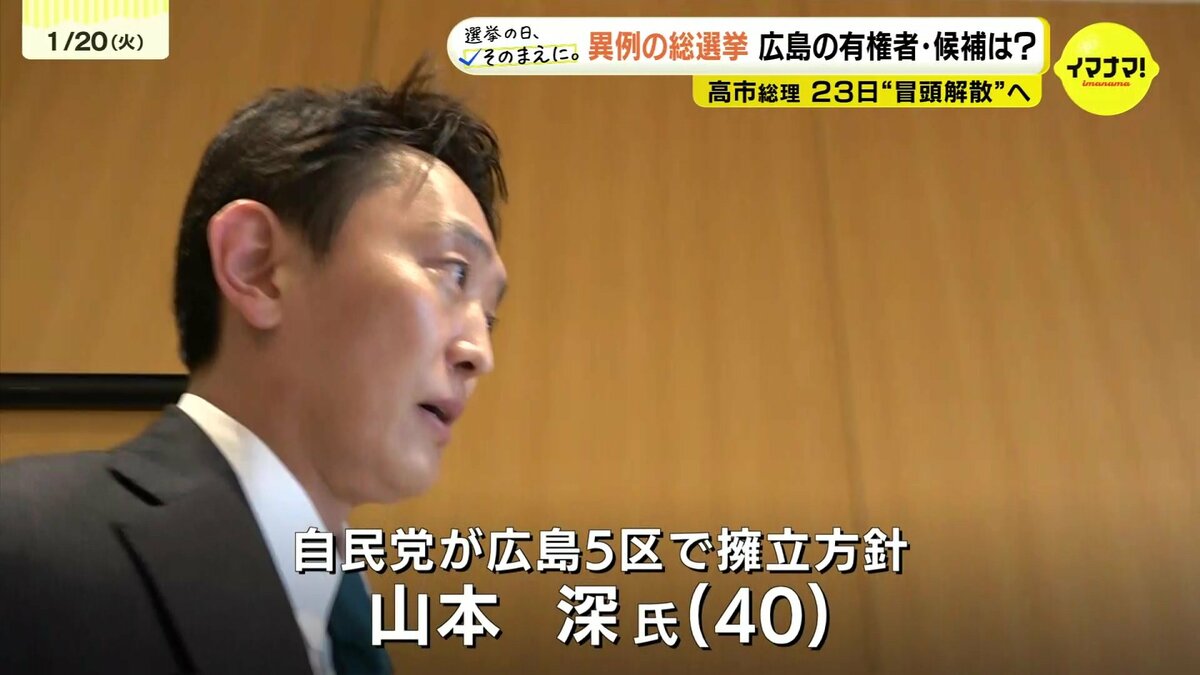 広島5区ではこのほか、自民党が財務省出身の山本深氏(40)を擁立する方針のほか、日本共産党から猪原真弓氏(65)が出馬を表明しています。