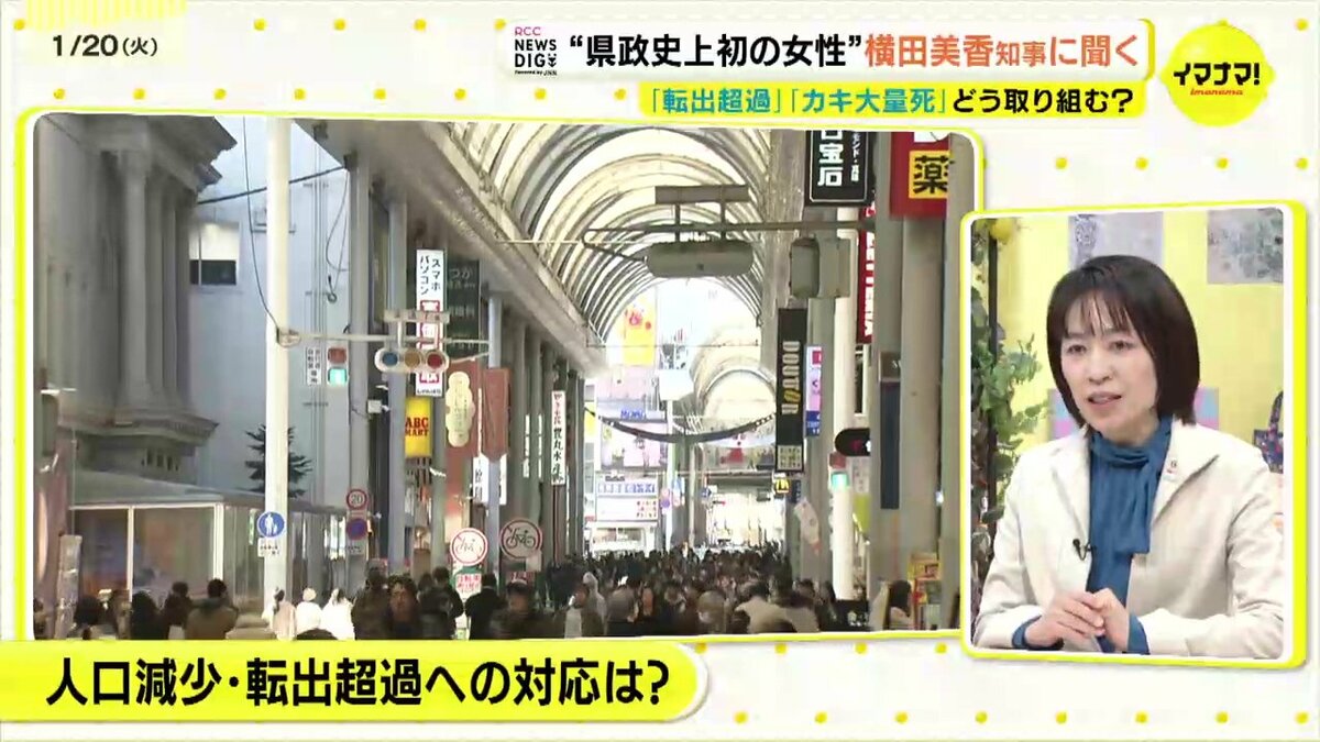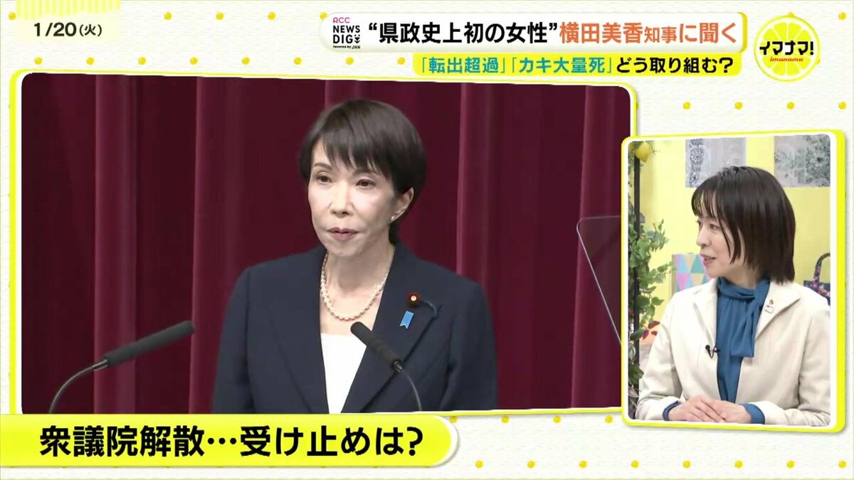 広島県の横田美香知事は20日、RCCのスタジオを訪れ「イマナマ!」の生放送に出演しました。就任から2ヶ月が経とうとするなか、県政課題への取り組みや、知事として2026年にかける思いを番組MCの青山高治アナウンサー、中根夕希アナウンサーに語りました。