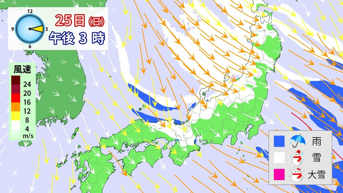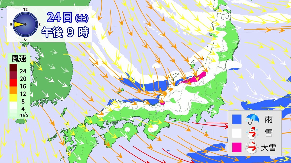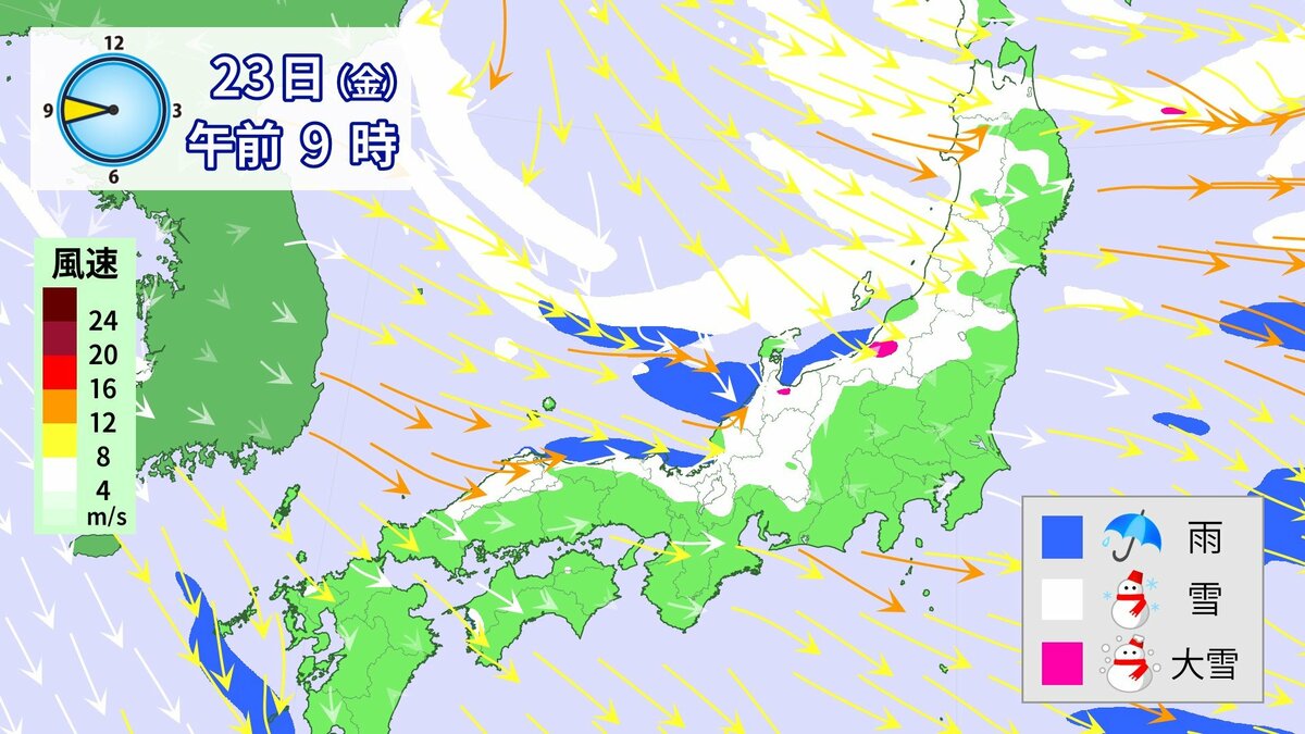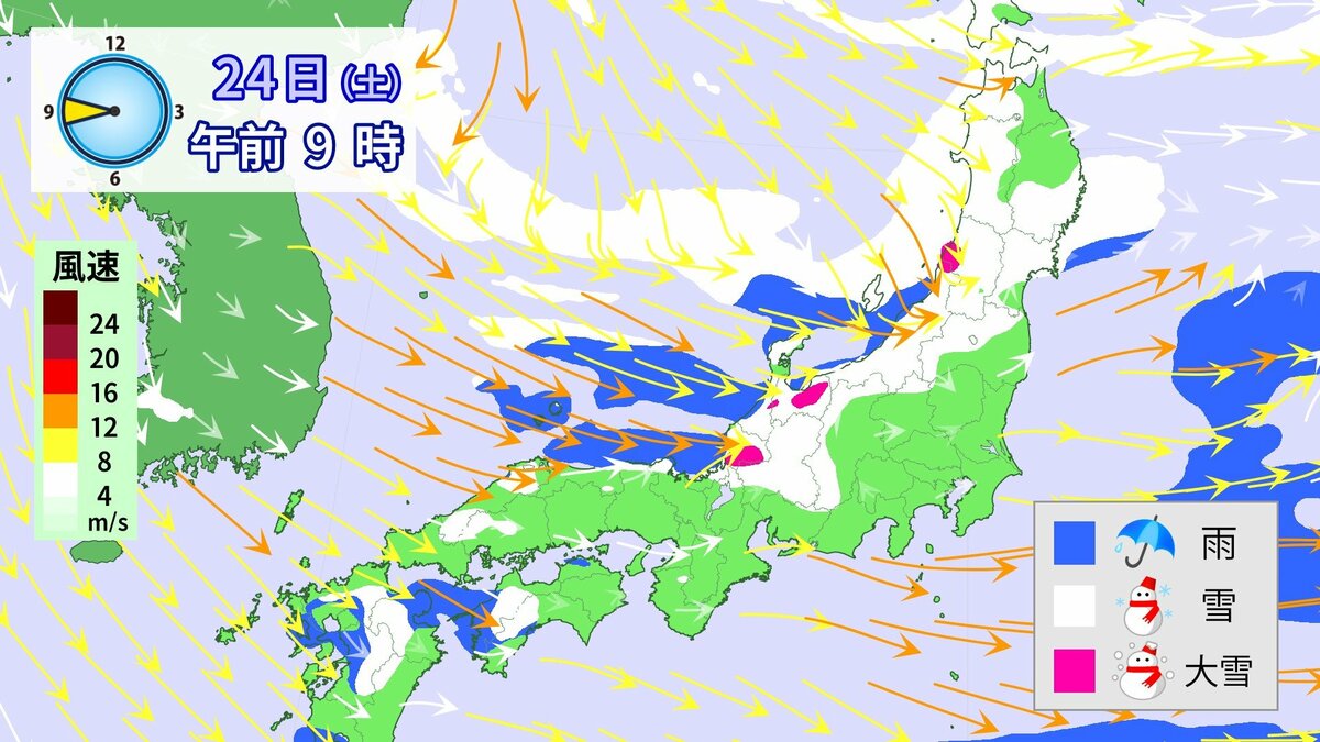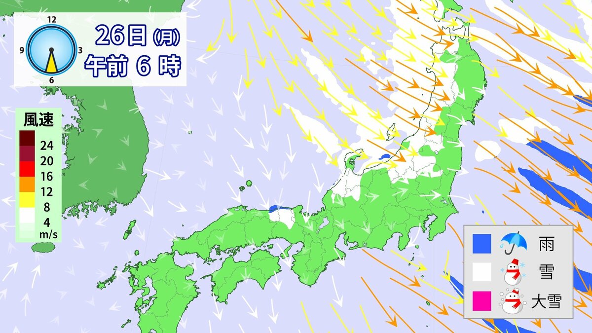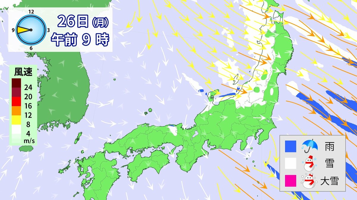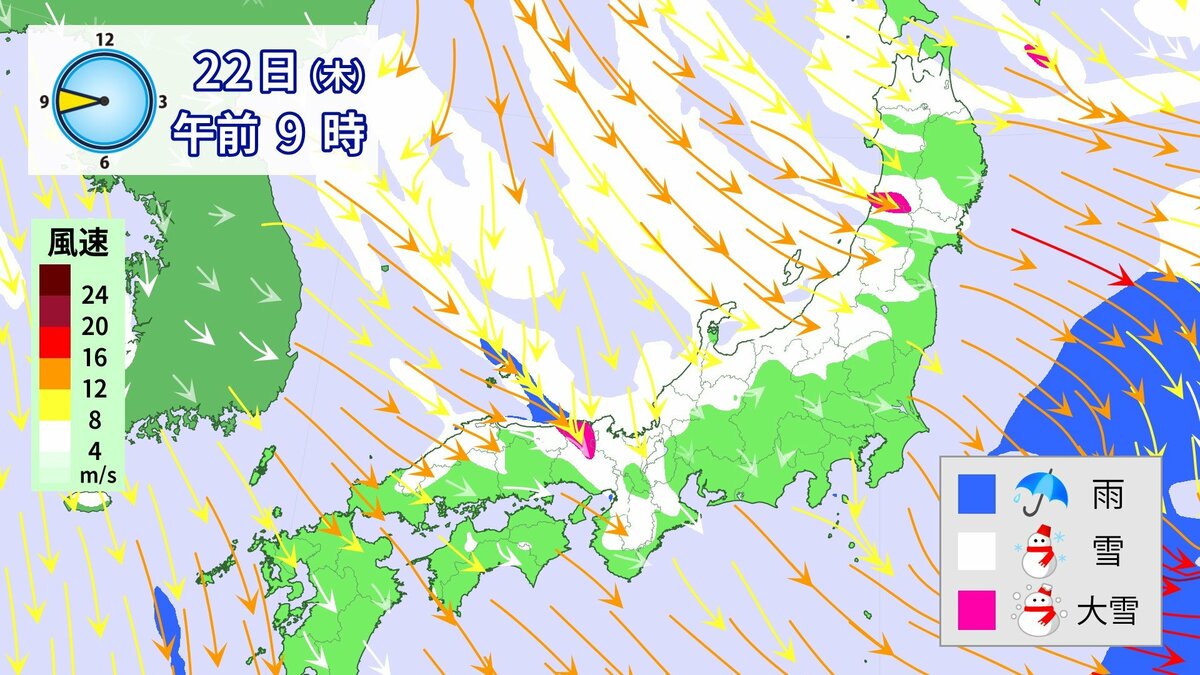日本から西日本では日本海側を中心に、山沿いや山地だけではなく、平地でも大雪となる所があり、短時間に降雪が強まるおそれがあります。また、普段雪の少ない太平洋側でも大雪となる所がある見込みです。