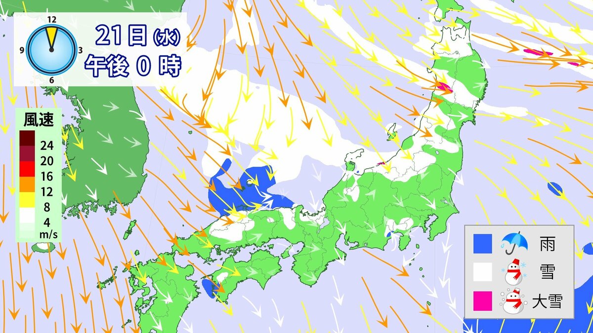 気象庁によりますと、北日本から西日本では25日頃にかけて、日本海側を中心に、山沿いや山地だけではなく平地でも大雪となる所があるでしょう。大雪や路面の凍結による交通障害に注意・警戒し、着雪やなだれに注意してください。特に22日は、北陸地方から山陰にかけての日本海側を中心に降雪量がかなり多くなるおそれがありますので、22日にかけて大雪に警戒してください。山陰では、21日夜遅くから22日夕方にかけて警報級の大雪となる見込みです。