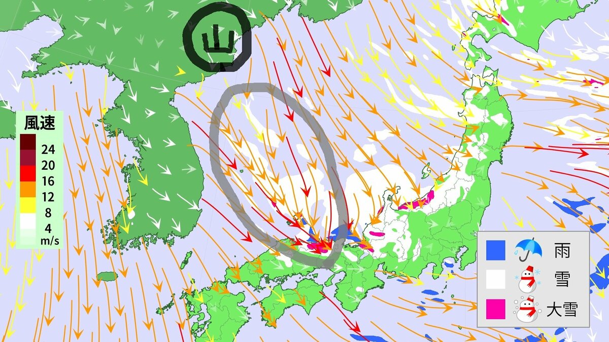 今回、北陸地方から山陰にかけての日本海側を中心に降雪量がかなり多くなる理由のひとつが、「JPCZ」日本海寒帯気団収束帯です。寒気が大陸から日本に向かう途中に、北朝鮮にそびえる約2700mの山にぶつかり、流れが二分され、日本海で再び合流するした部分が雪雲を強めます。「JPCZ」のかかる地域では、短時間に積雪が急増してしまいます。今回の寒波では、「JPCZ」の指向先が山陰から北陸方面へ移動する見込みです。