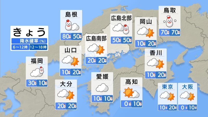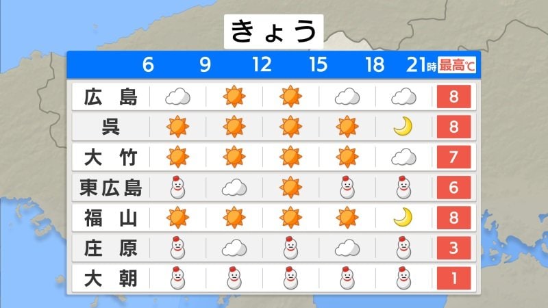 天気 2026.01.21 【きょう1/21(火)広島天気】寒波スタートで真冬の寒さ続く 北部で積雪増える 各地凍結注意 PR きょう21日(水)朝の広島県は、きのうまでより冷え込みが強まりましたが、ほぼ平年並みの最低気温となりました。広島1.1℃、三次-1.5℃、神石高原町油木で-5.8℃でした。 上空には、平地で雪を降らせるレベルの強い寒気が入り、降れば各地で雪となる見込みです。現在は、県西部を中心に降っています。北部では積雪が増え、南部でも積もるところがある見込みです。今回は、長い期間寒気が続くので、雪が溶けにくく、積雪が増えて凍結もしやすいので注意が必要です。 PR