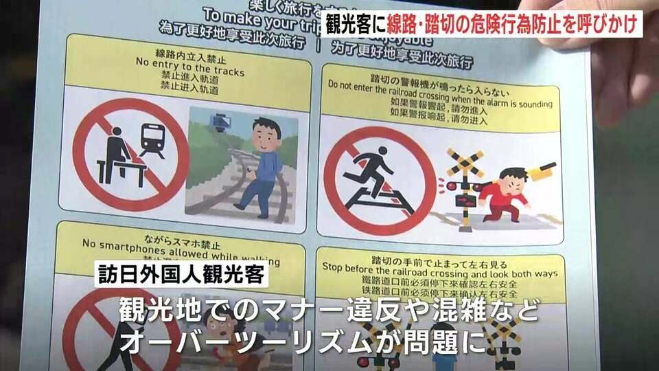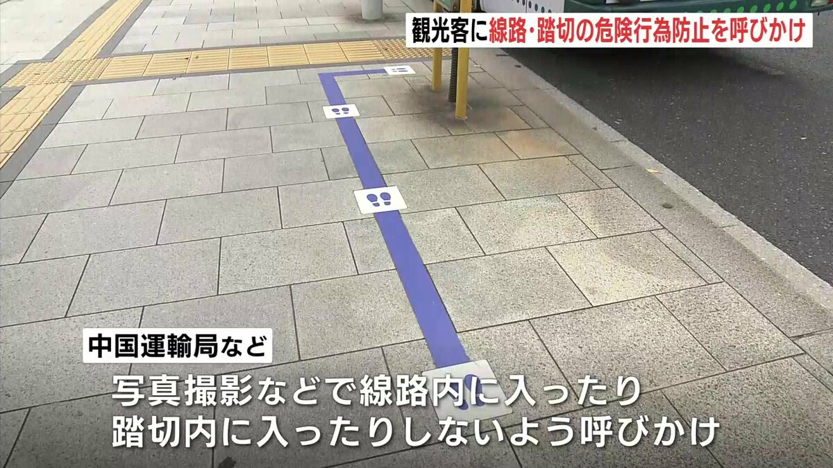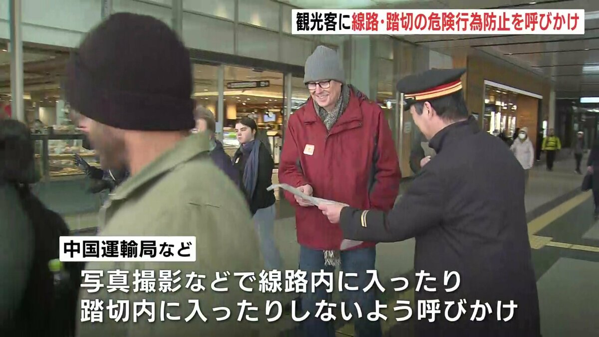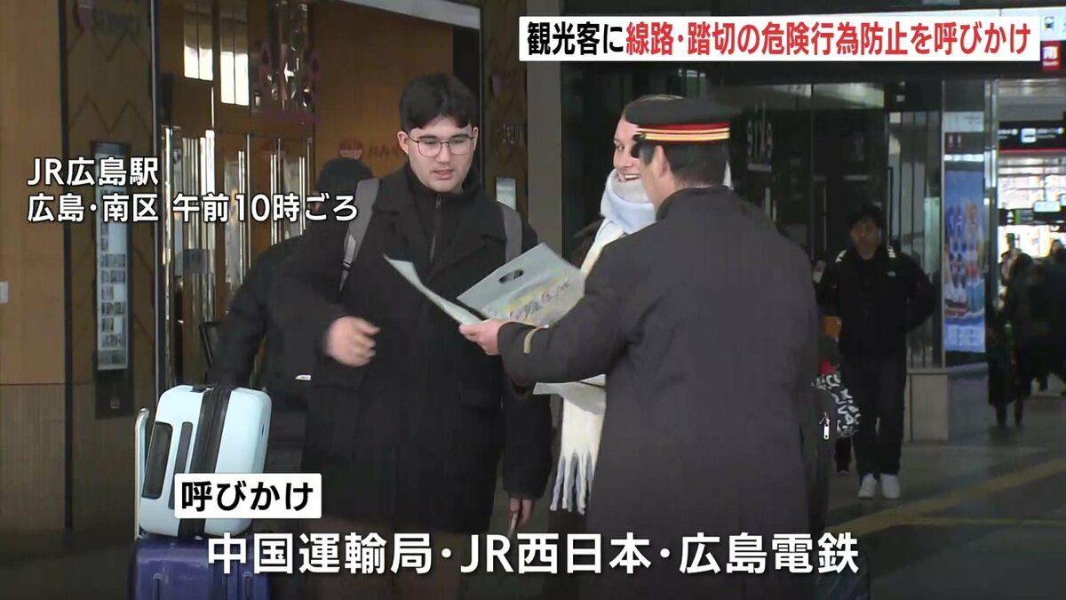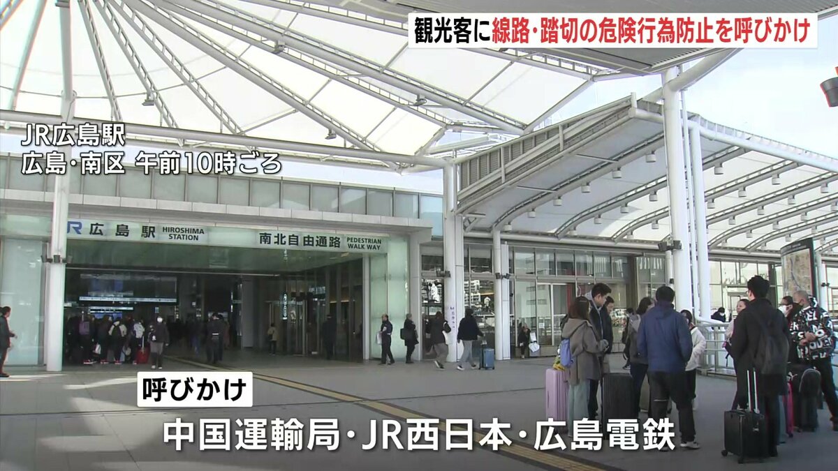 外国人観光客が写真撮影のために線路や踏切に立ち入るなどしないように、中国運輸局・ JR西日本・広島電鉄の3団体が21日、広島市南区の広島駅で注意を呼びかけました。
