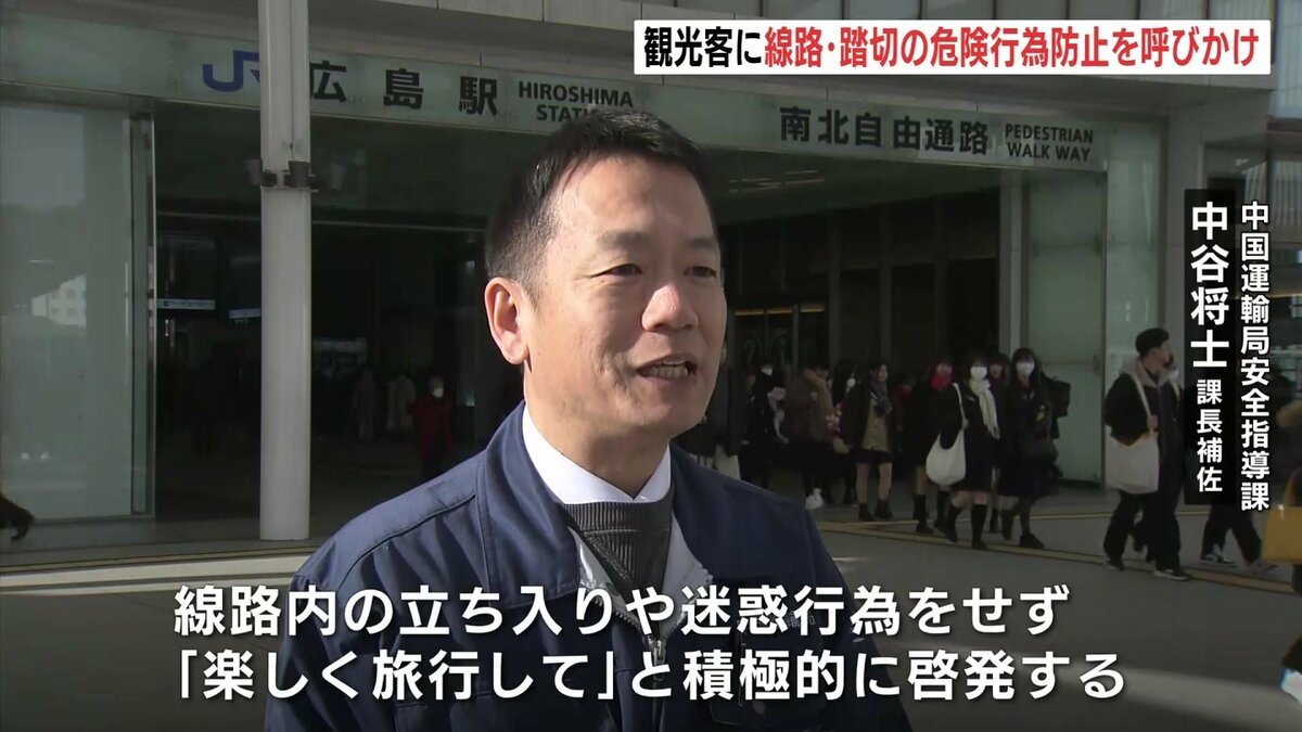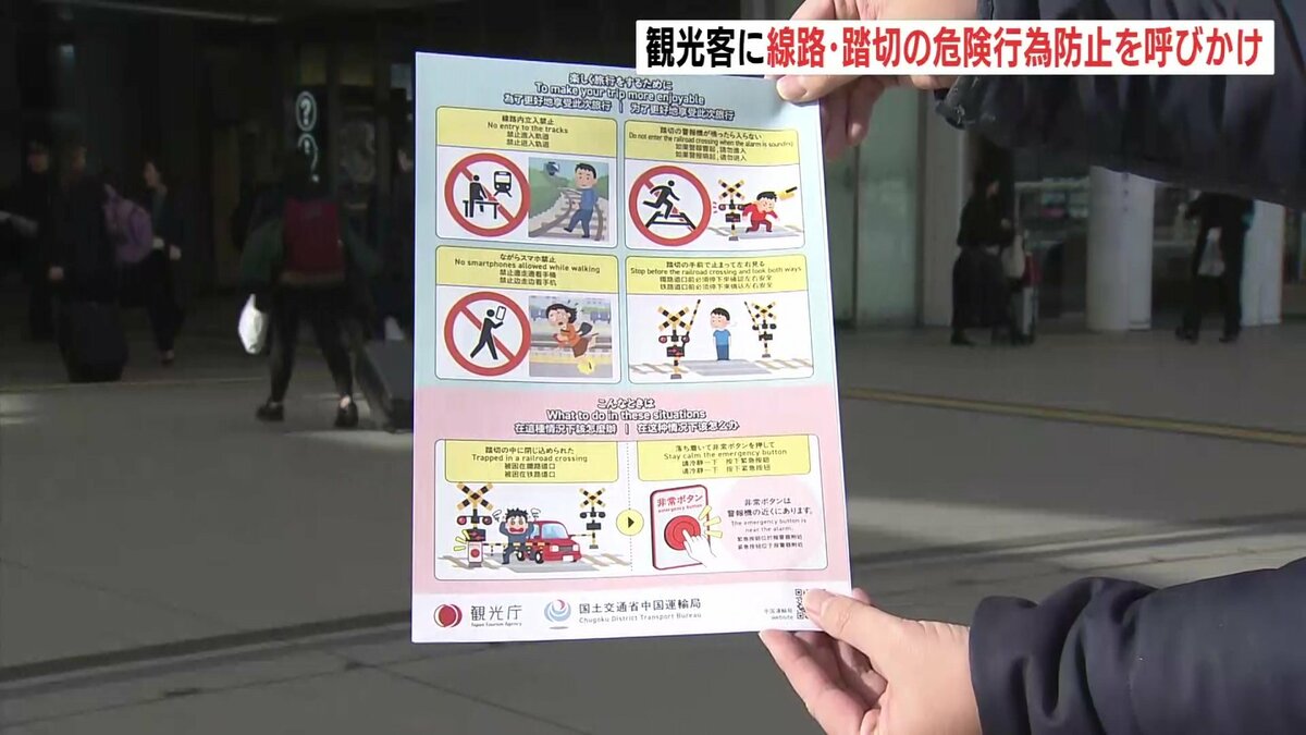 第4弾となる今回は、写真撮影などを目的に線路内に入ったり、遮断機がおりた踏切内に入ったりしないよう、観光客が多い広島駅で呼びかけました。