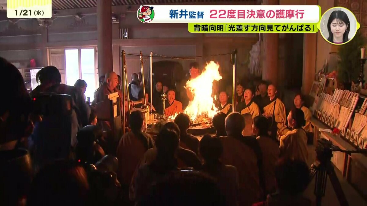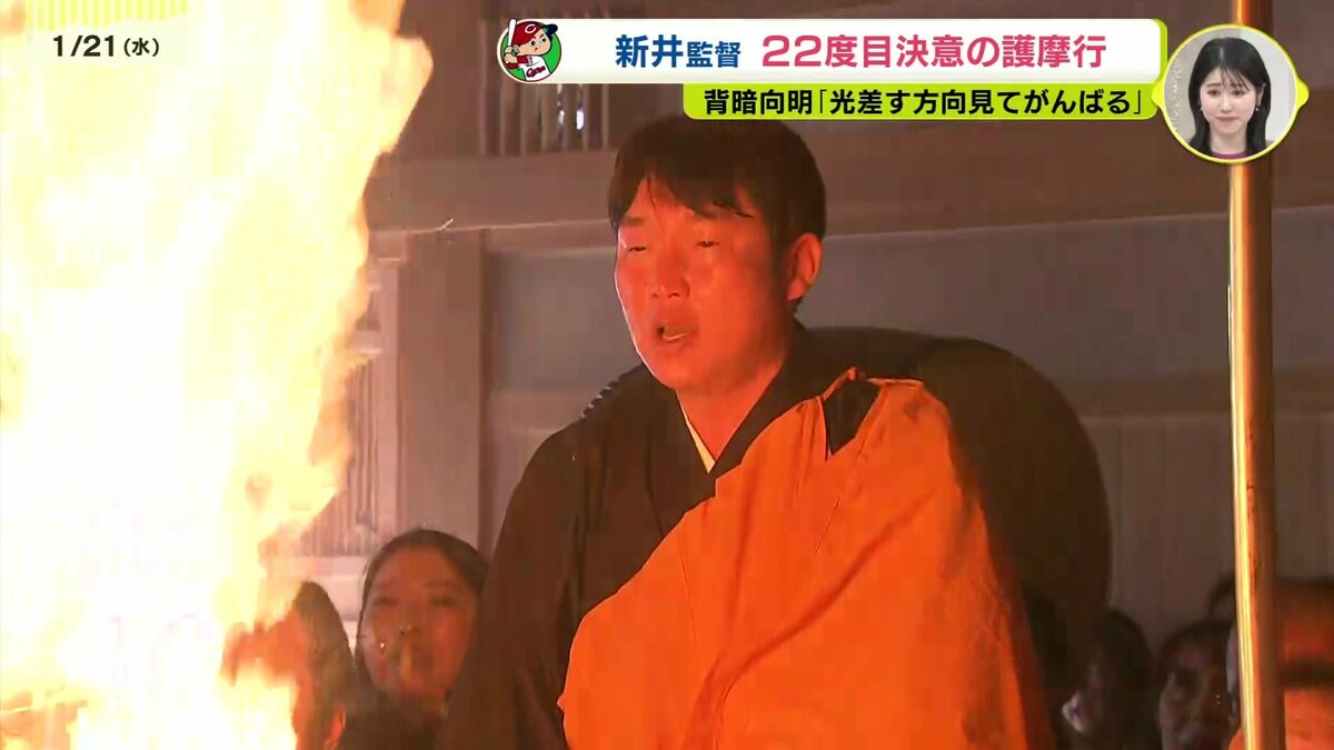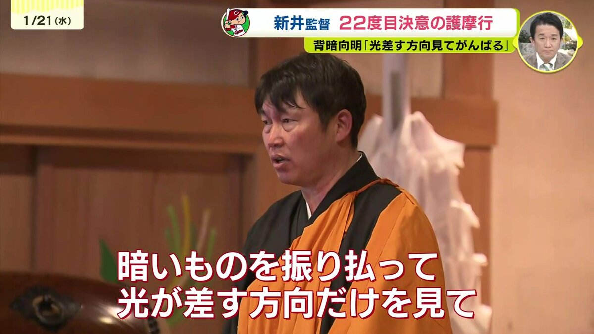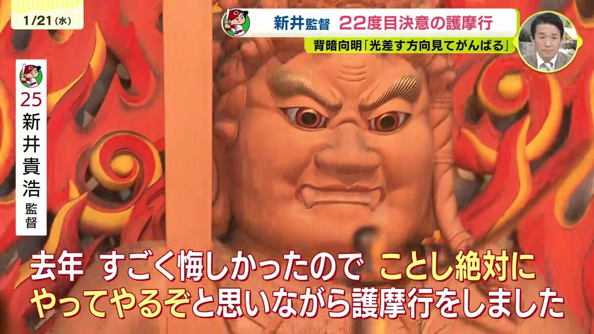 1時間50分、炎と向き合い汗びっしょりとなった新井監督は、参加者の前で住職からもらった言葉を胸に決意を新たにします。