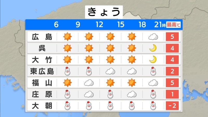 上空には、強い寒気が入り、このあとも北部中心に積雪が増える見込みです。積雪や凍結による交通障害にご注意ください。日中も気温が上がりにくく、予想最低気温は、庄原1℃、広島・福山5℃、呉4℃の予想です。山沿いでは1日中0℃を下回る真冬日となる見込みです。暖かくしてお過ごしください。