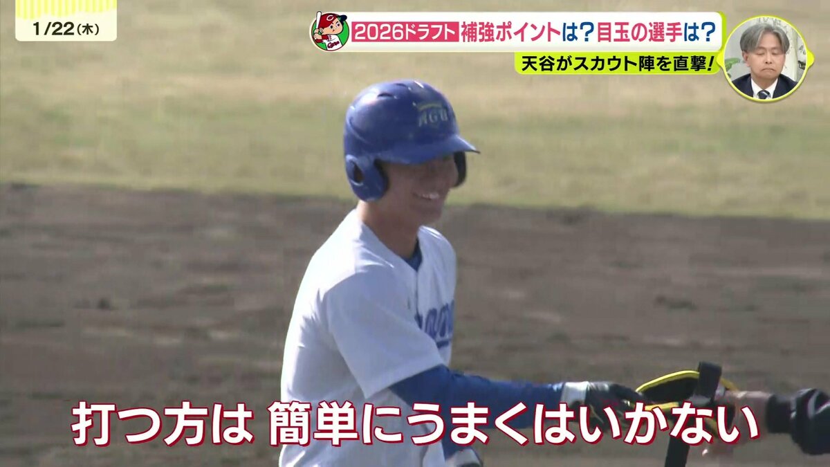 カープの補強ポイントはキャッチャーだと聞いて、数々のドラフト候補選手を生で見てきた天谷さんは、関東の名門・青山学院大学のあるキャッチャーが今年の目玉になると予想。