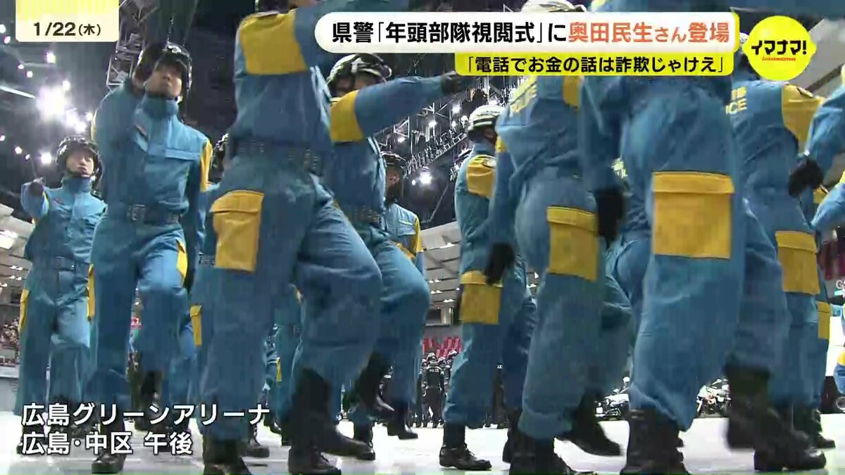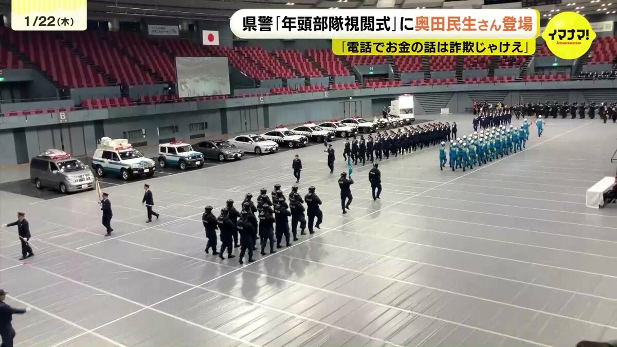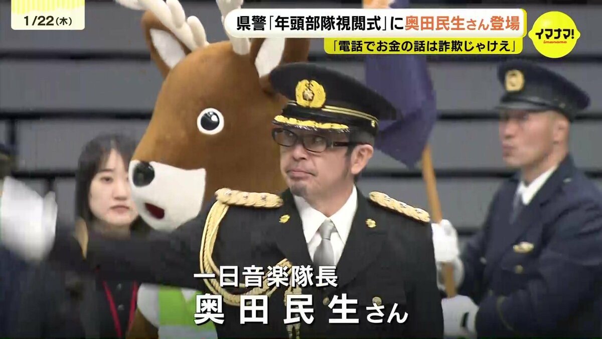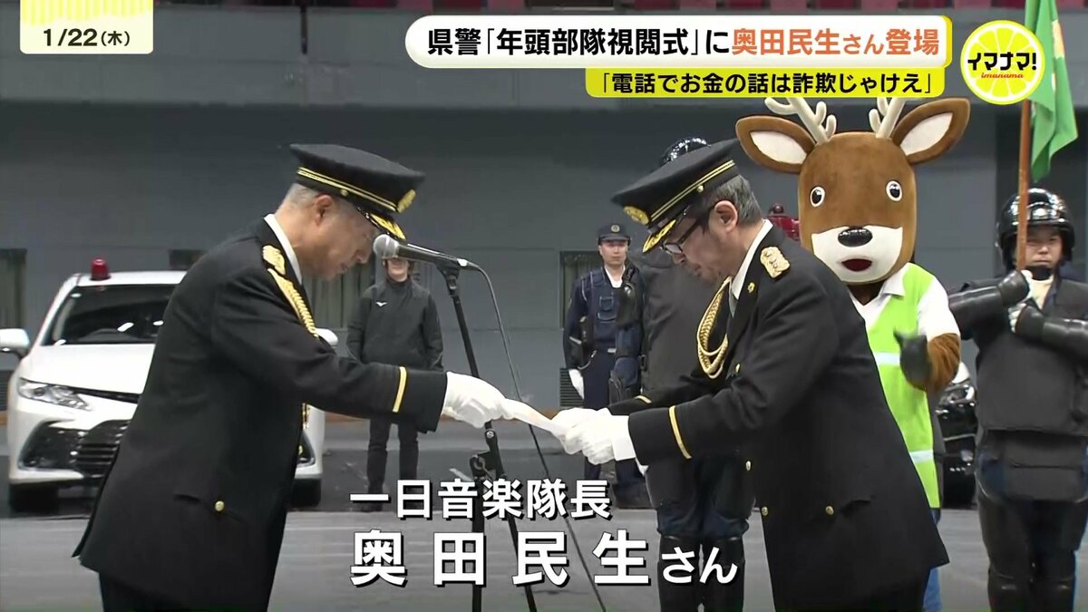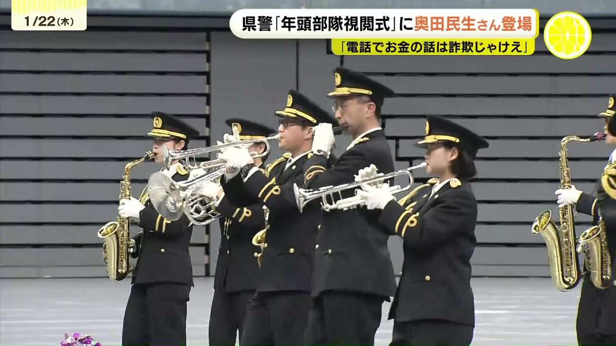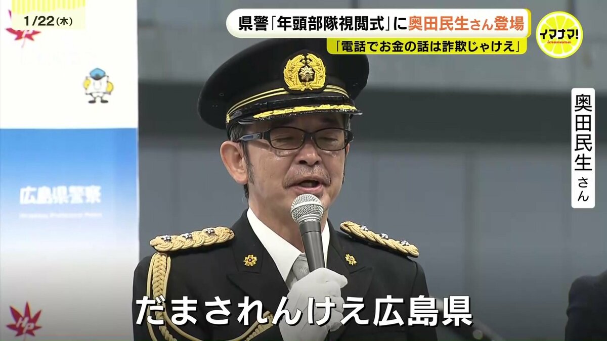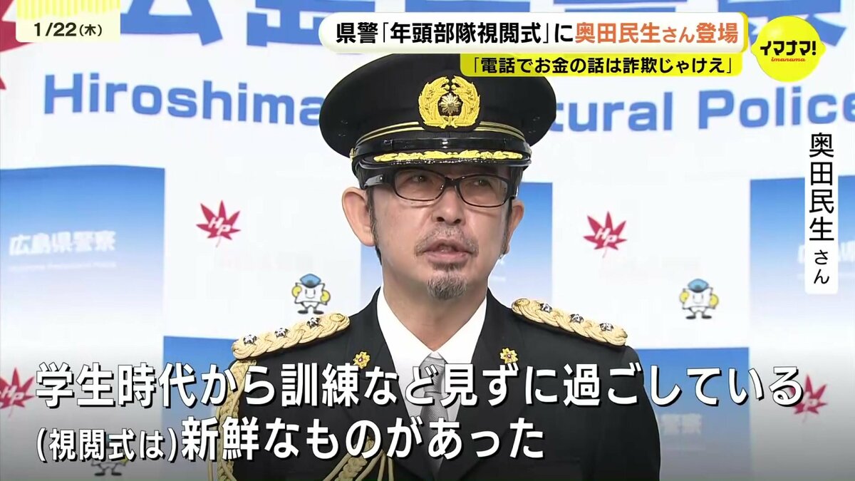 広島県警が22日、新年恒例の「年頭部隊視閲式」を行い、ミュージシャンの奥田民生さんも登場しました。