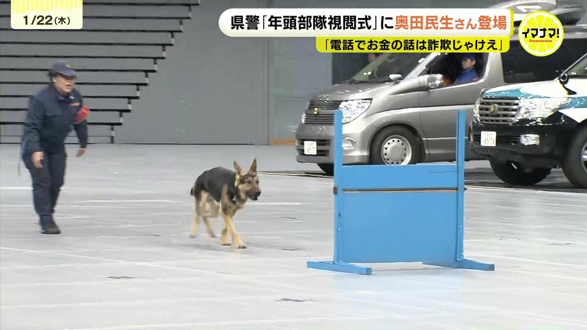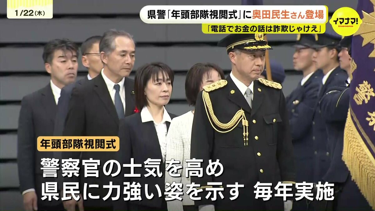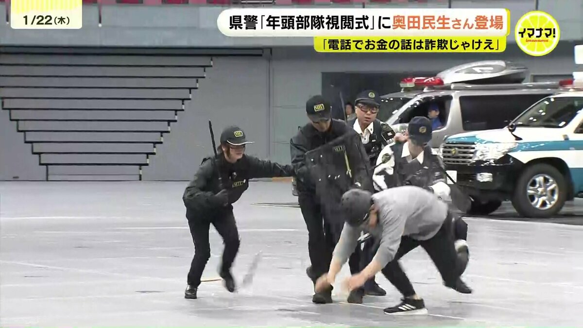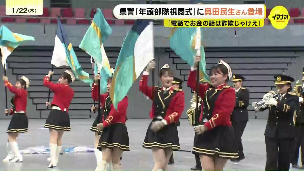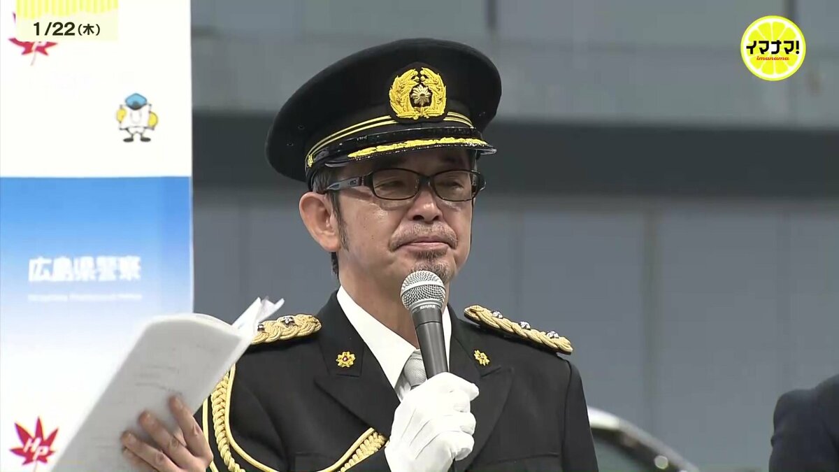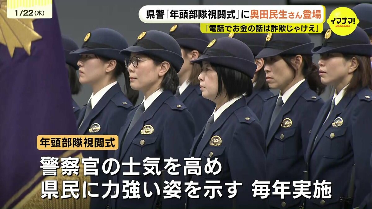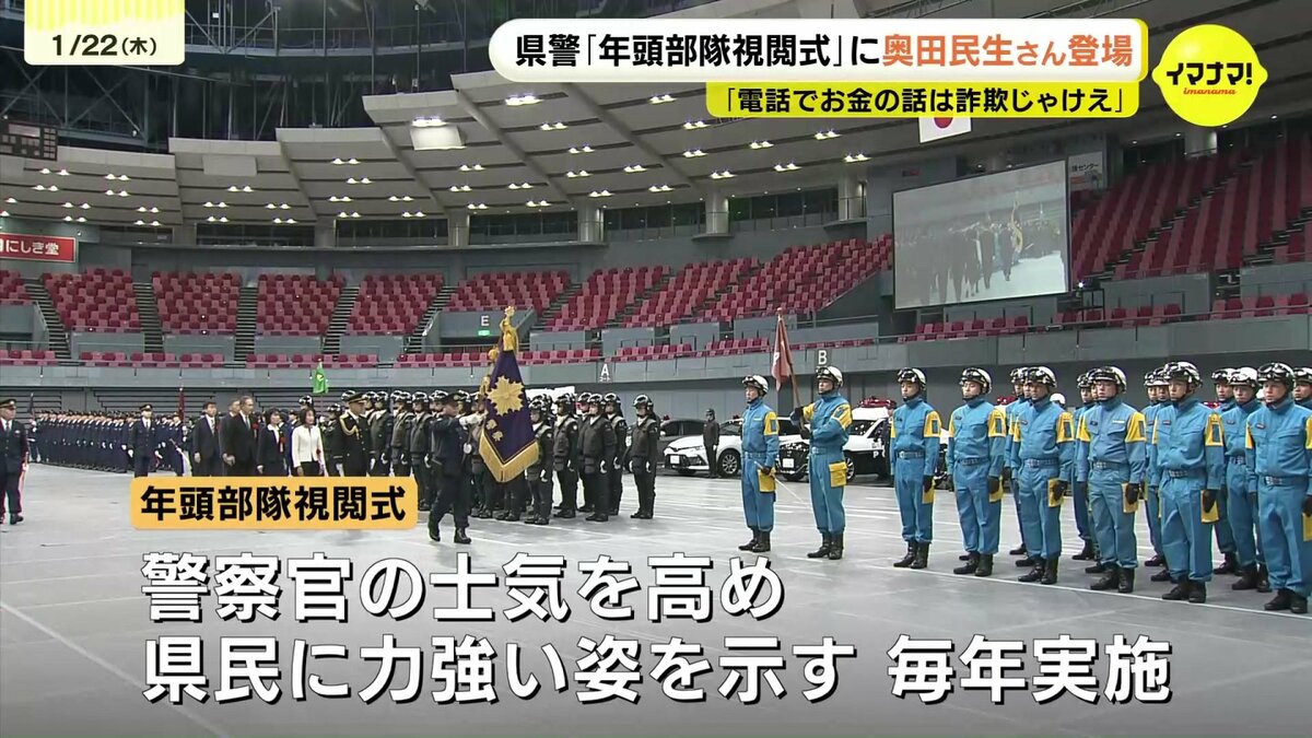 広島県警が22日、新年恒例の「年頭部隊視閲式」を行い、ミュージシャンの奥田民生さんも登場しました。