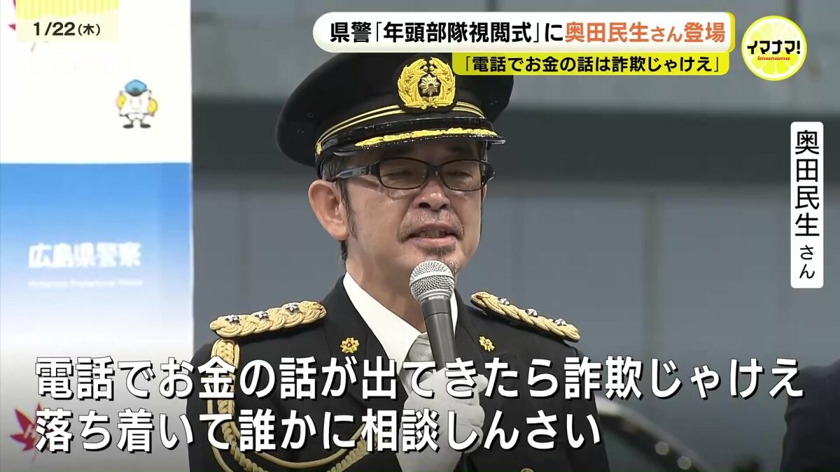 また、特殊詐欺についてのトークショーで、知り合いの若手スタッフが詐欺被害に遭ったことを明かした奥田さんは、「電話でお金の話が出てきたら詐欺じゃけえ、落ち着いて誰かに相談しんさい」と広島弁で注意を呼びかけました。