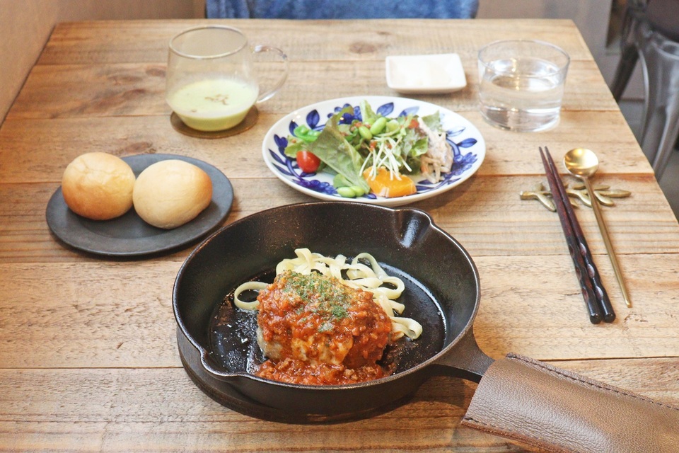 「シナモン定食」のメインは、スキレットで熱々のまま提供されるハンバーグ。フライパンで焼き色をつけた後、オーブンでじっくり火を通すので、表面はこんがり、中は肉汁たっぷりのジューシーな味わい。