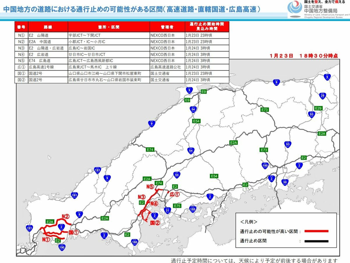 中国地方の高速道路と主要国道のうち、通行止めの可能性がある区間は次の通りです。(23日午後6時半発表)