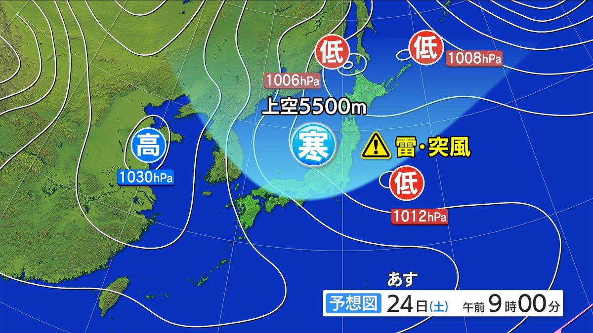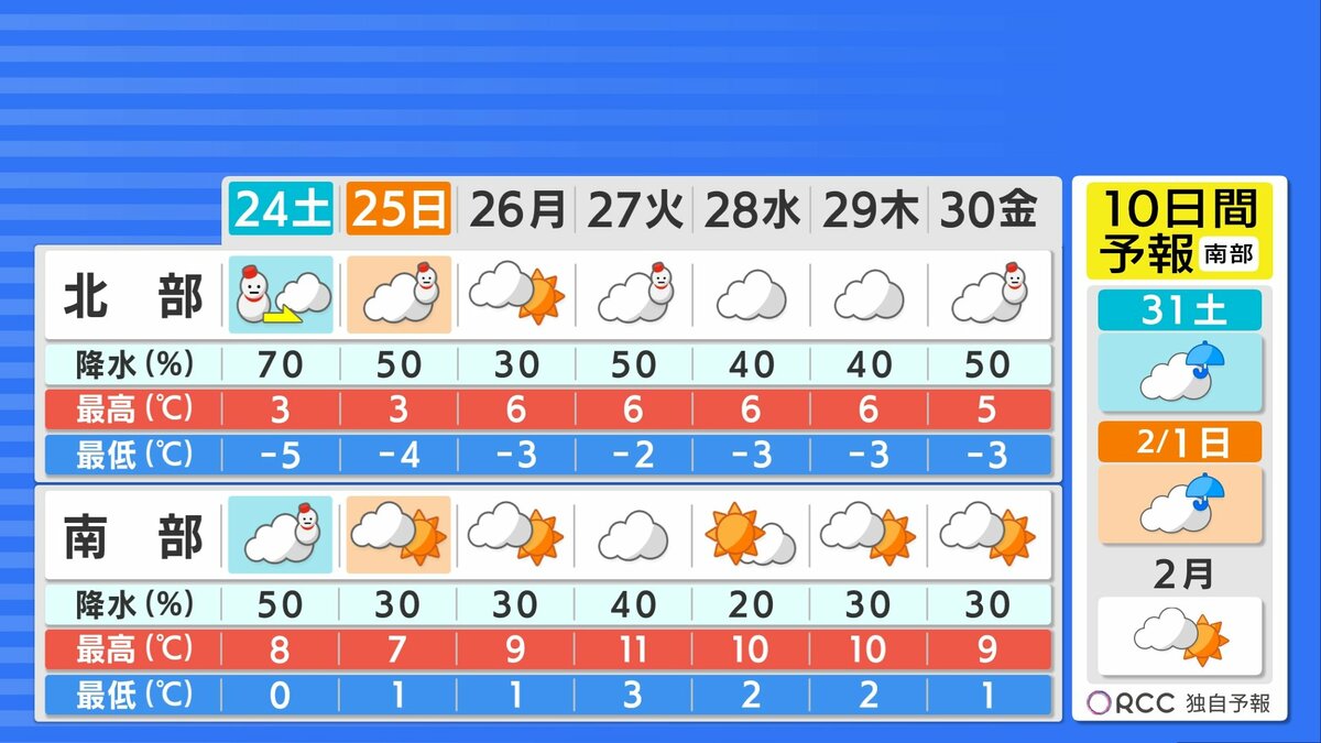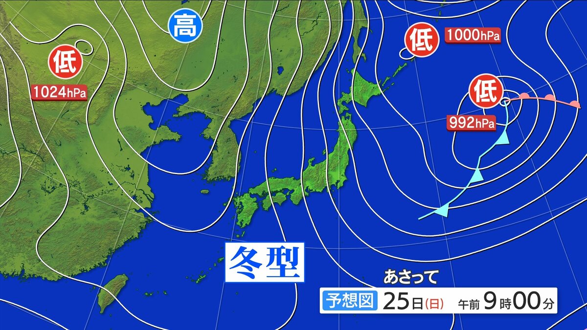 あさって25日(日)は、引き続き強い冬型となり、上空の寒気は強い見込みです。南部では日差しが届きますが、暖かさは感じにくいでしょう。北部では雪が降る予想です。
