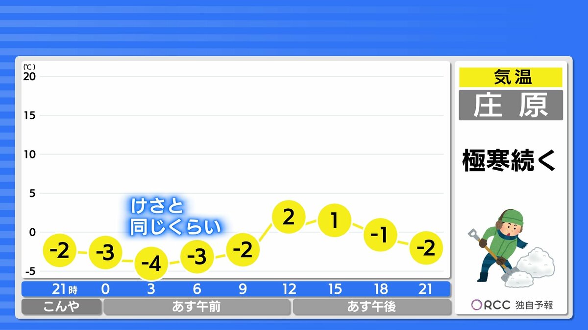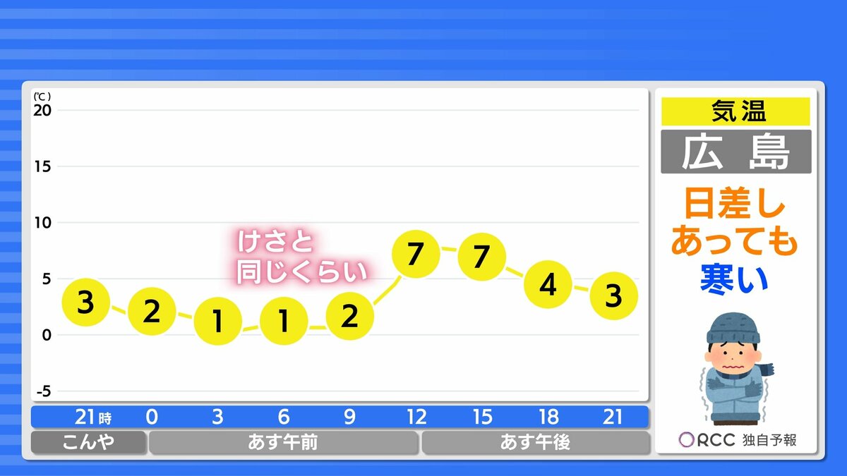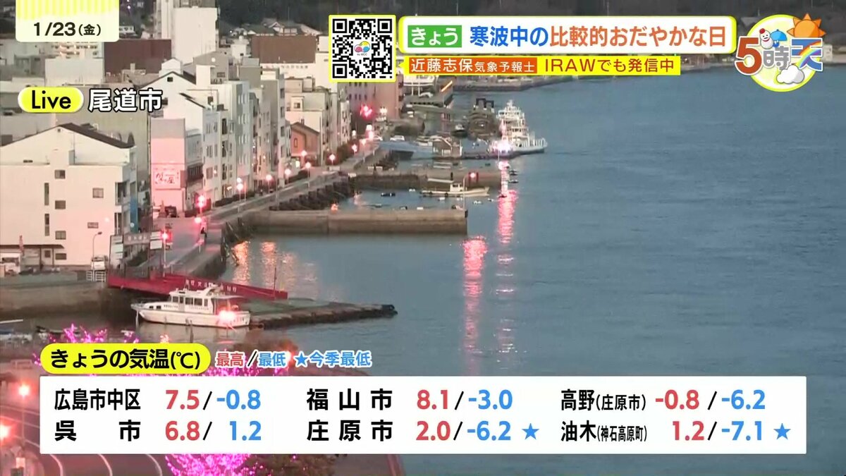 今日23日(金)の広島県内は、寒波中でも比較的穏やかな天気となり、南部では日差しが届きました。日差しがあっても暖かさは感じにくく、最高気温は、広島市中区で7.5℃、庄原市高野町では-0.8℃、1日通して氷点下の真冬日となりました。