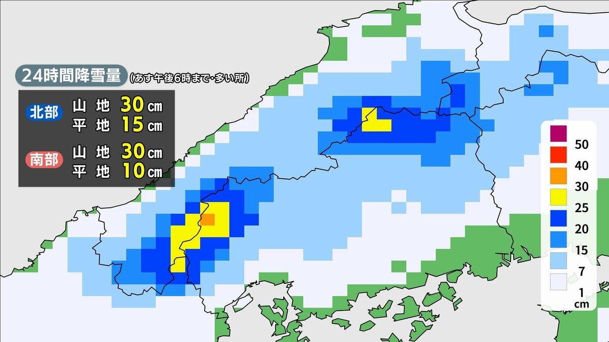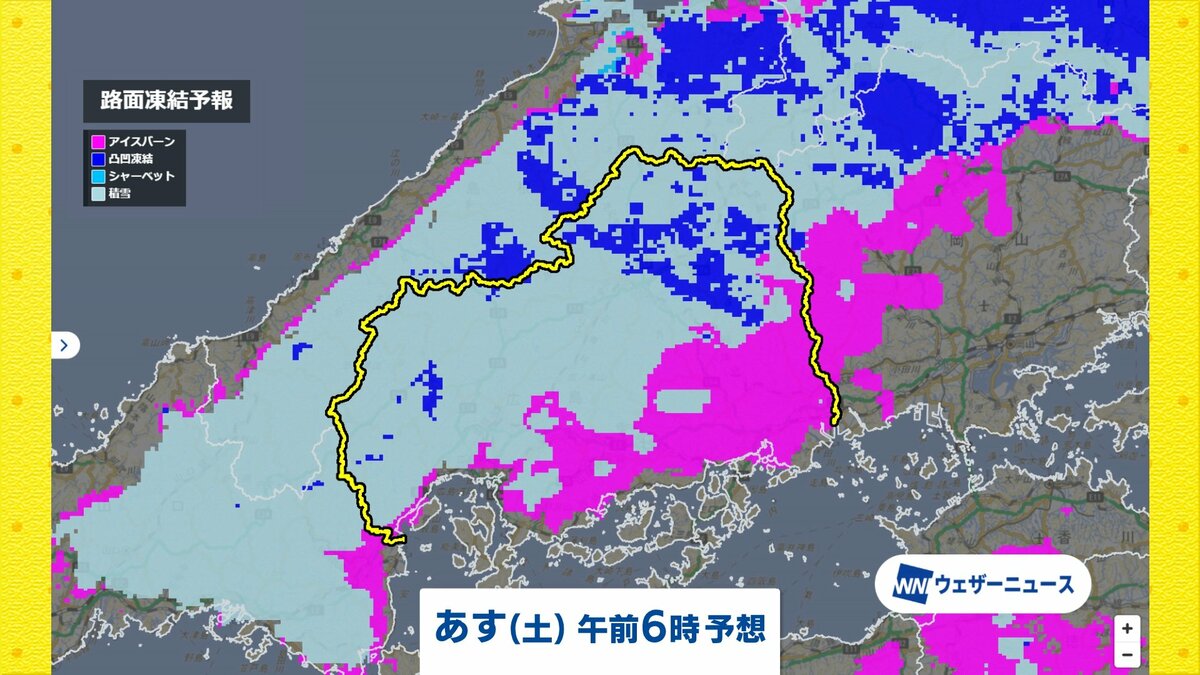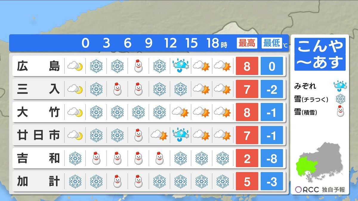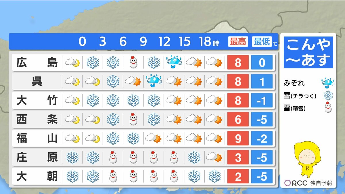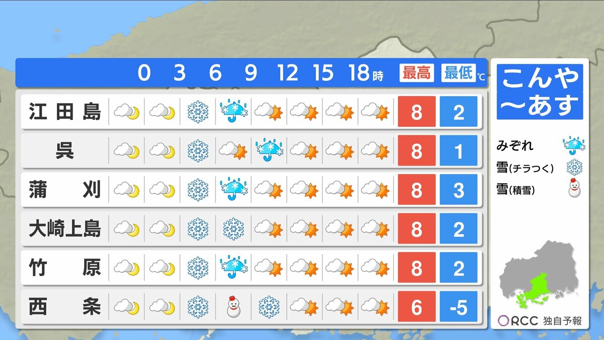 明日24日(土)は、引き続き冬型の気圧配置で、上空の高い所には強い寒気が入っています。大気の状態が非常に不安定となり、雷や突風にも注意が必要です。午前中は県の広い範囲に雪雲が流れ込み、沿岸部でも雪が降り、雪が積もる所がある見込みです。北部では降り方が強まり、積雪が増える予想です。路面の凍結・積雪による交通障害にご注意ください。気温は今日と同じくらいで、広島・呉で8℃、福山9℃、庄原3℃の予想です。