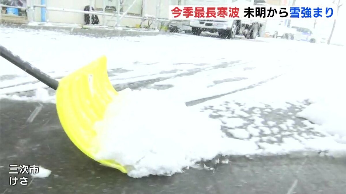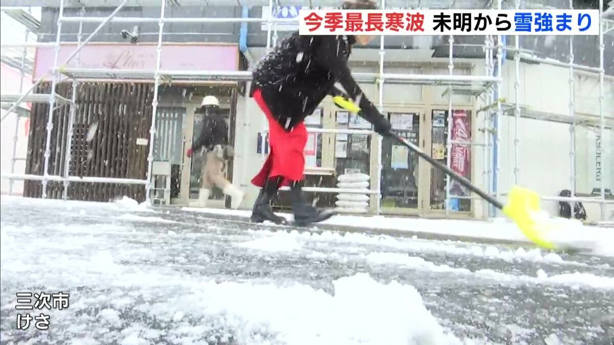 今朝の三次市中心部では、道路や橋に雪が積もり、雪かきや慎重に通行する人たちの姿がみられました。