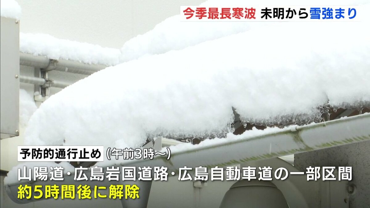 未明から強まった雪の影響で、山陽道・広島岩国道路と広島自動車道の一部区間で午前3時から約5時間、予防的通行止めが実施されました。