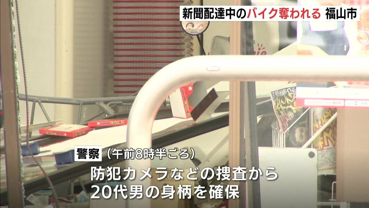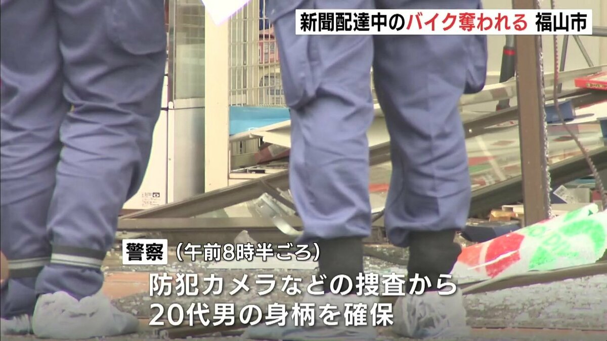 26日早朝、広島県福山市で、新聞配達中のバイクが奪われる強盗事件がありました。警察は事情を知っているとみられる男の身柄を確保し、話を聴いています。