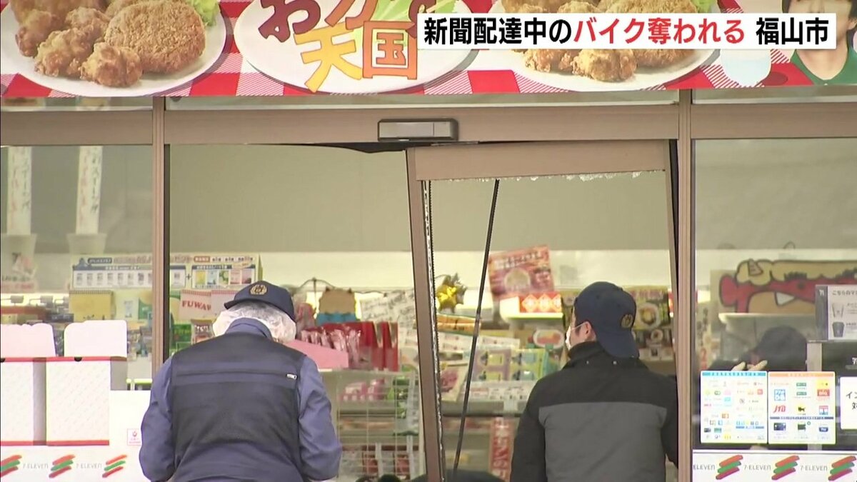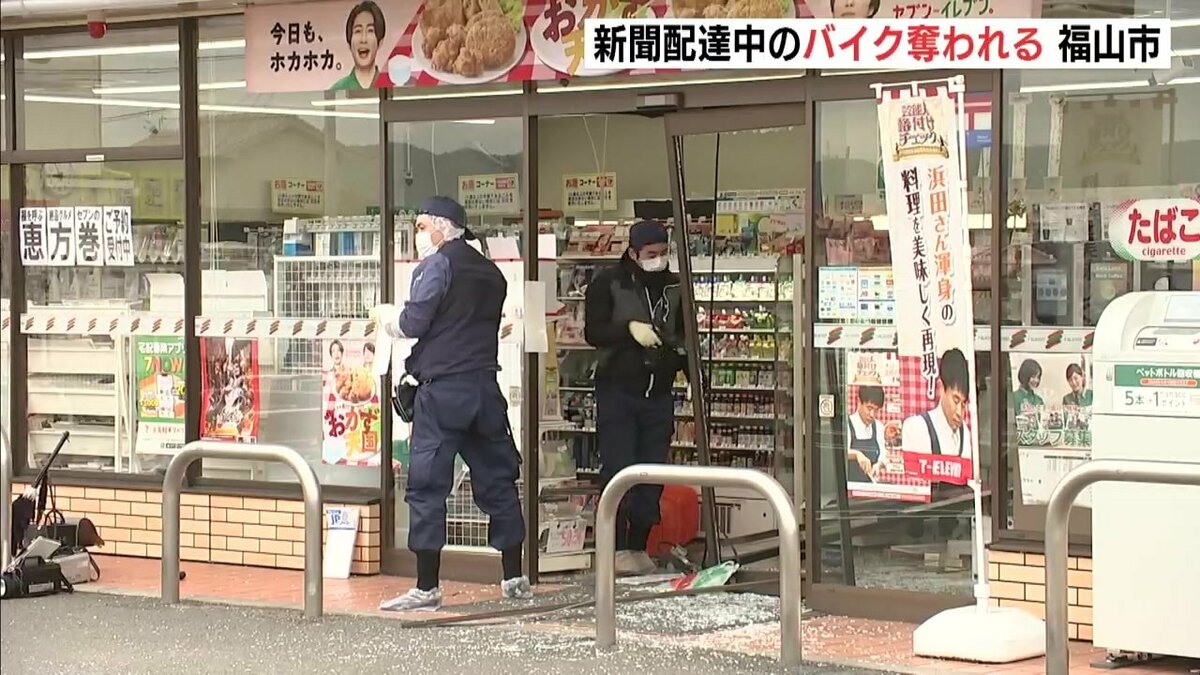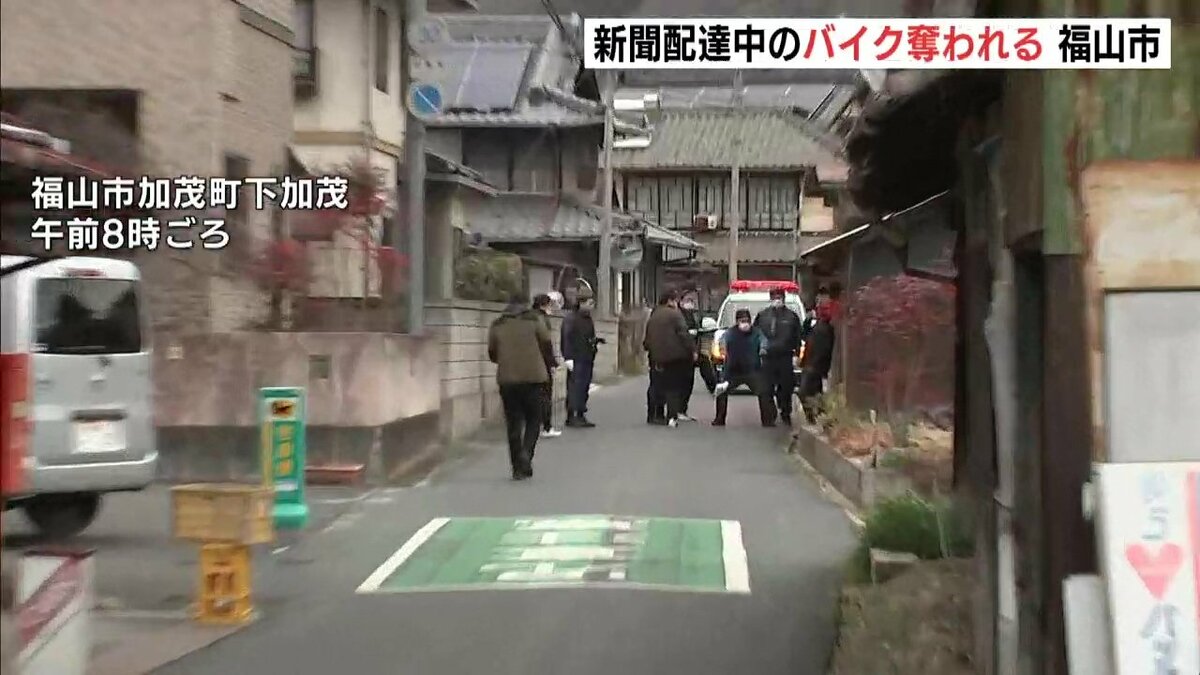 警察によりますと、26日午前5時20分ごろ、福山市加茂町下加茂の路上で新聞配達員の男性から「バイクを盗まれた」と110番通報がありました。男が男性が乗っていた原付バイクを蹴って男性を転倒させ、バイクを奪って逃走したということです。