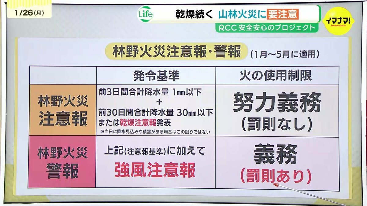 大船渡の大規模火災を受けて、2026年1月から新たな取り組みとして始まったのが「林野火災注意報・警報」制度です。1月から5月に、山や森林で火災が起こりやすい気象状況になったときに「注意報」や「警報」を発表します。広島県では▼前3日間の合計降水量が1mm以下で前30日間の合計降水量が30mm以下または▼前3日間の合計降水量が1mm以下で乾燥注意報が出たときに「林野火災注意報」を発表。※当日に降水が見込まれる場合や積雪がある場合は、この限りでない。注意報基準に加えて、強風注意報が出されると「林野火災警報」を発表。